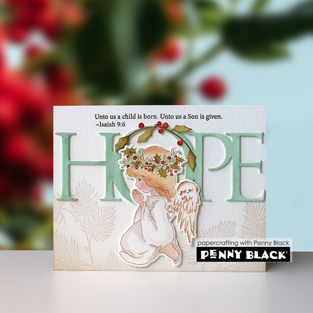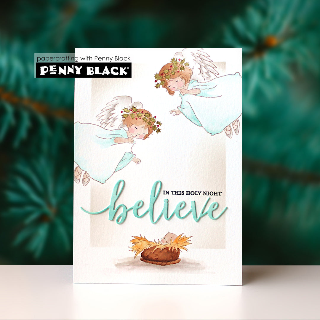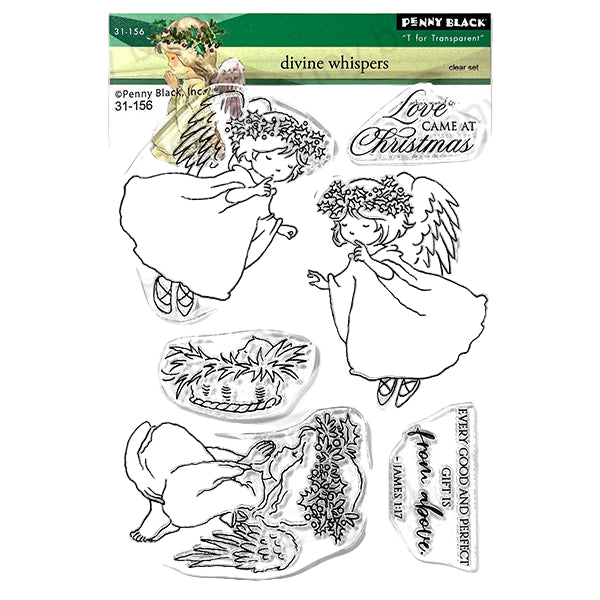 Penny Black Divine Whispers Clear Stamps is a 5 x 6.5 inch set featuring three sweet little angels, a baby in a manger, and two sentiments, perfect for holiday cards and seasonal projects. Coordinates with the Divine Whispers Cut Out Dies 51-935, sold separately.