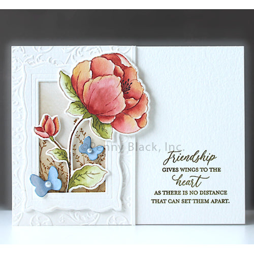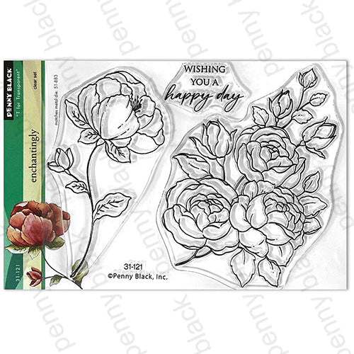 The Penny Black Enchantingly Clear Stamps is a 5x6.5-inch set featuring two floral images—a single peony and a bouquet of peonies—along with one sentiment. Coordinating Enchantingly Dies 51-883 are sold separately.