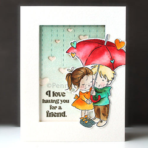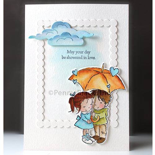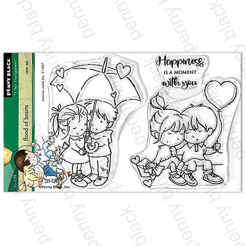 The Penny Black Flood of Hearts Clear Stamps is a 4x6-inch stamp set featuring three stamps: two showcasing an adorable couple—one cuddling under an umbrella and the other sitting on a bench with a heart-shaped balloon and an envelope spilling over with hearts. The set also includes one sentiment. Coordinating Flood of Hearts Dies 51-887 are sold separately.