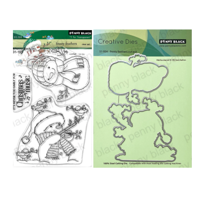 Penny Black Frosty Feathers Clear Stamp and Die Set includes the 4x6 inch Frosty Feathers Clear Stamps 31-155 and the coordinating Frosty Feathers Cut Out Dies 51-934. This delightful set features two adorable snowmen with their feathered friends, along with one sentiment, perfect for winter and holiday crafting. The coordinating die set includes two outline dies that match the stamped images, making it easy to cut and layer for added dimension. Compatible with most leading die-cutting machines, this set is ideal for creating charming seasonal projects.