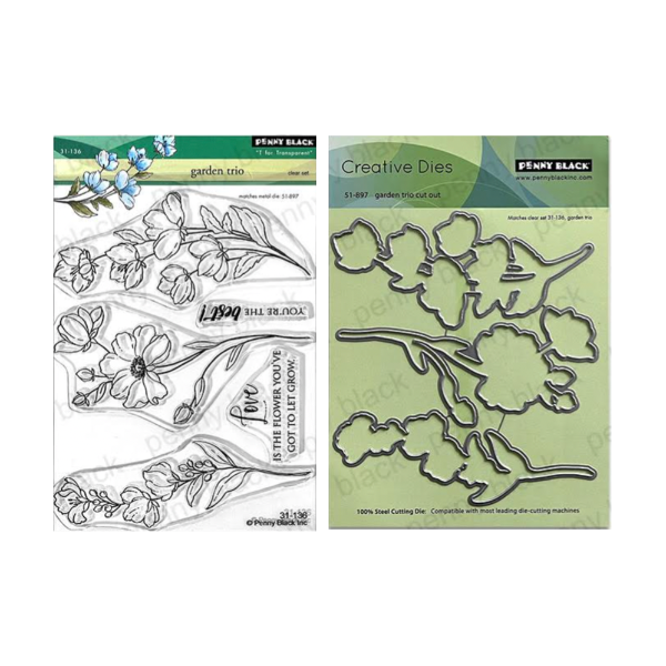 Penny Black Garden Trio Clear Stamp and Die Set. This coordinating set includes the Garden Trio Clear Stamps 31-136, a 5 x 6.5 inch set featuring three elegant floral images and two sentiments, along with the Garden Trio Cut Out Dies 51-900, a set of three dies designed to cut out the stamped images.