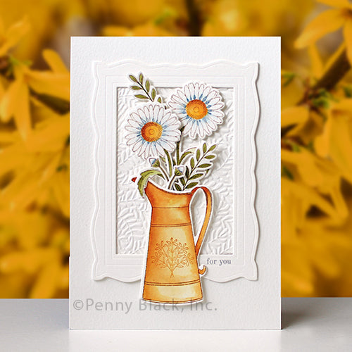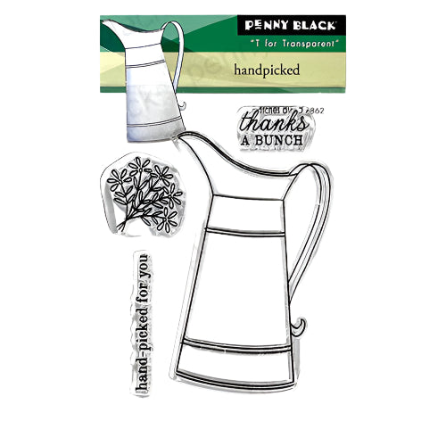 Penny Black Hand Picked Clear Stamps is a 3x4 inch set with four stamps, including a water pitcher, a small floral bouquet, and two sentiments. Coordinating Hand Picked Cut Out Dies 51-862 sold separately.