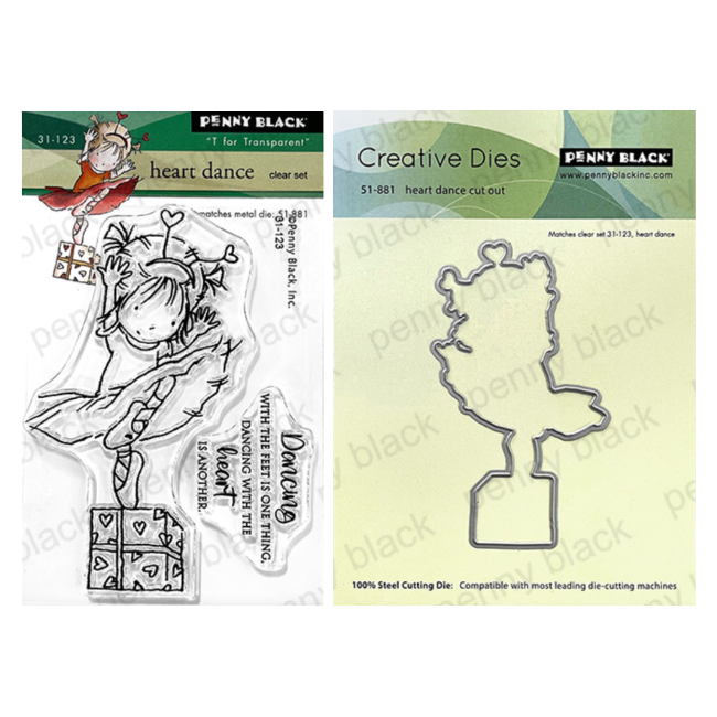 The Penny Black Heart Dance Clear Stamp 31-123 and Die 51-881 Set includes a 3x4-inch clear stamp set featuring two stamps: a sentiment and an adorable image of a little ballet dancer standing on a decorated box. The set also includes one coordinating die, perfect for adding dimension and detail to your crafting projects.