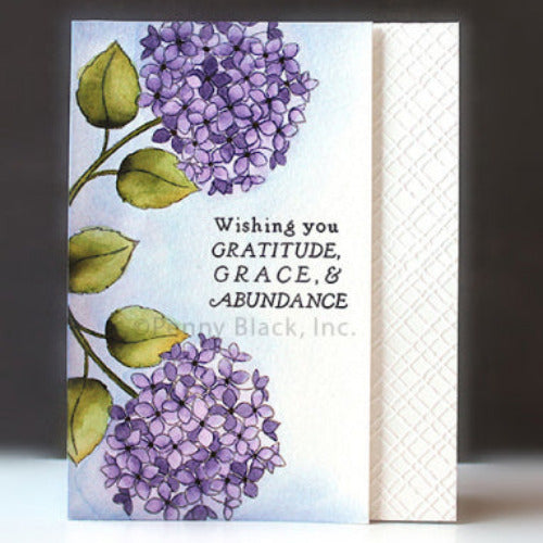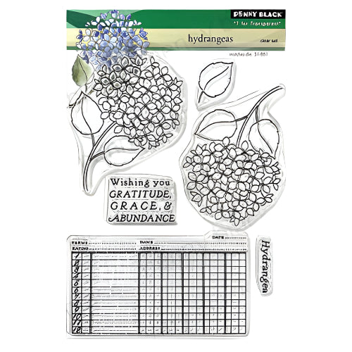 The Penny Black Hydrangeas Clear Stamps set measures 5 x 6.5 inches and includes beautifully illustrated designs perfect for floral-themed projects. This set features two hydrangea flower images, a single leaf, two sentiments, and a tracking grid card. For added dimension and easy layering, coordinating Hydrangeas Cut Out Dies 51-861 are available and sold separately.