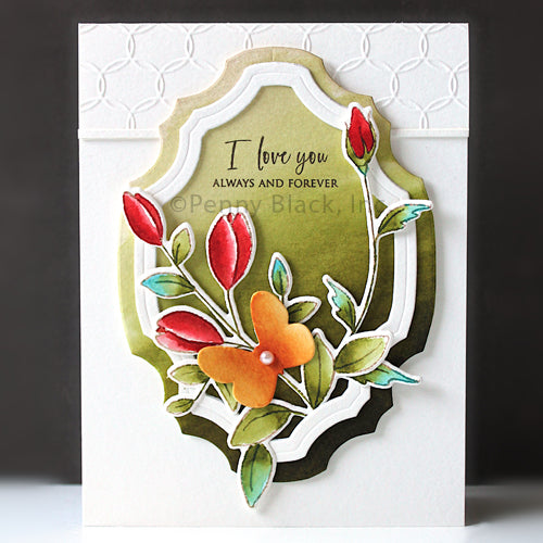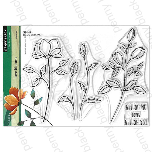 The Penny Black Love Blooms Clear Stamps is a 5 x6.5 inch clear stamp set featuring four delicate floral images and one sentiment. Coordinating Love Blooms Dies 51-882 are sold separately.Sentiment reads: All of me loves all of you