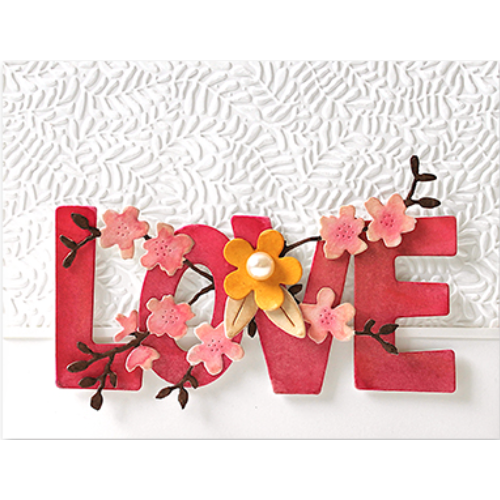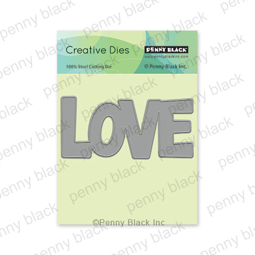 The Penny Black Love Letter Thin Metal Creative Die showcases the word 'LOVE' in bold block letters. This die has approximate measurements of 4.5 x 2.1 inches.