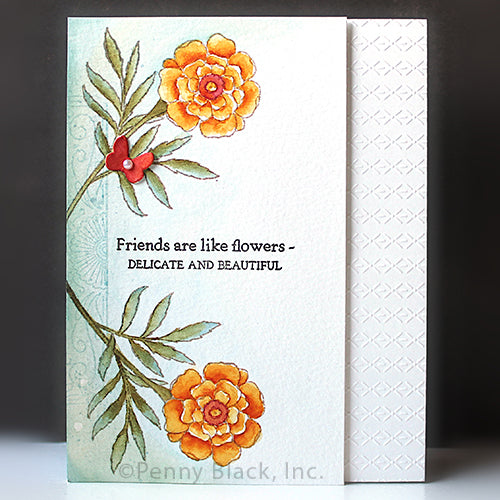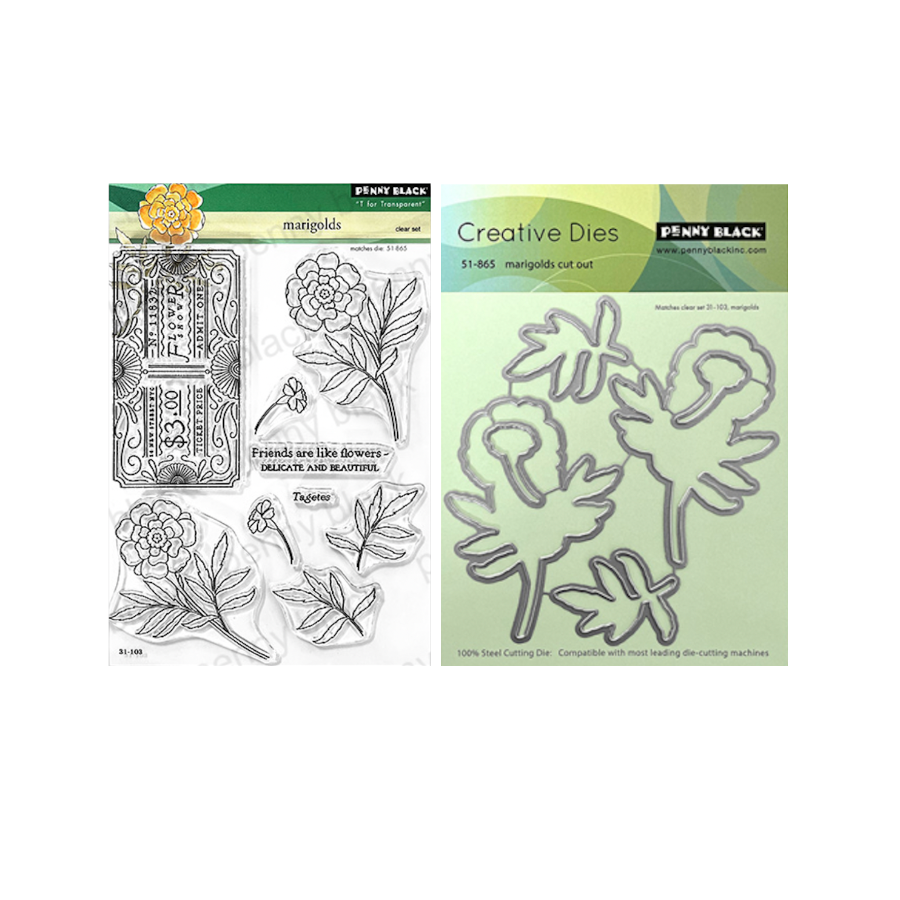 Penny Black Marigolds Clear Stamp and Die Set includes the 5 x 6.5 inch Marigolds Clear Stamps 31-103 and the coordinating Marigolds Cut Out Dies 51-865. The stamp set features four unique marigold blooms, two leaves, a flower show ticket, and two sentiments, perfect for creating elegant floral scenes. The coordinating dies are designed to cut out the stamped images and are compatible with most leading die cutting machines.