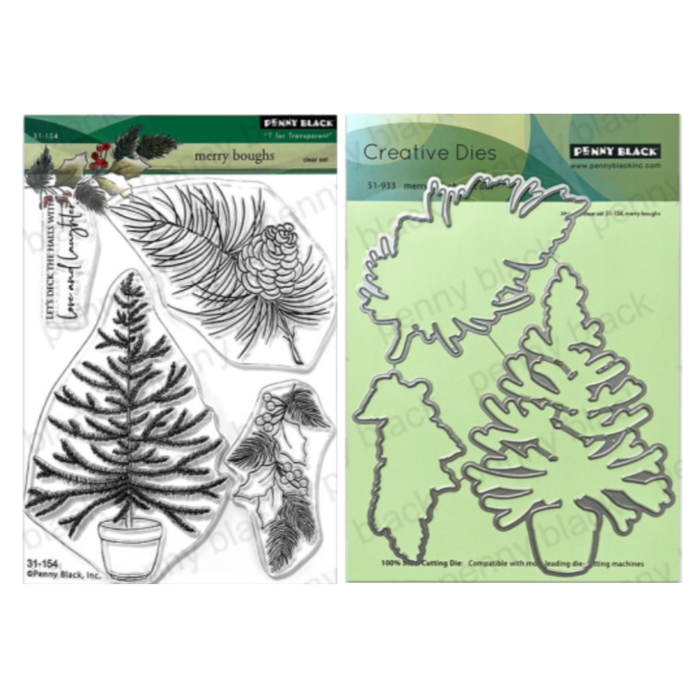 Penny Black Merry Boughs Clear Stamp and Die Set includes the 5 x 6.5 inch Merry Boughs Clear Stamps 31-154 and the coordinating Merry Boughs Cut Out Dies 51-933. This festive set features three detailed images of holiday greenery—a potted pine tree, a pine branch with a pinecone, and a pine branch with holly leaves and berries—along with one coordinating sentiment. The die set includes three outline dies that perfectly match the stamped images, making it easy to cut and layer for added dimension. Compatible with most leading die-cutting machines, this set is perfect for creating elegant holiday cards and seasonal projects.