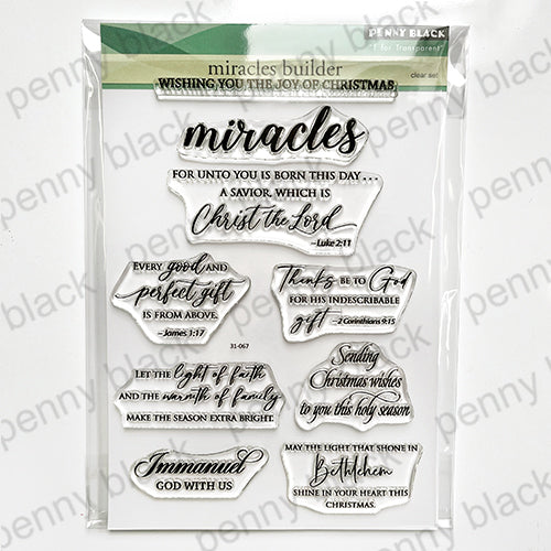 The Miracles Builder 5 x 5.6 inch Clear Stamp Set contains 9 sentiments to add to your holiday projects, all in different fun fonts!