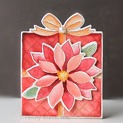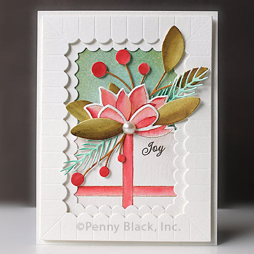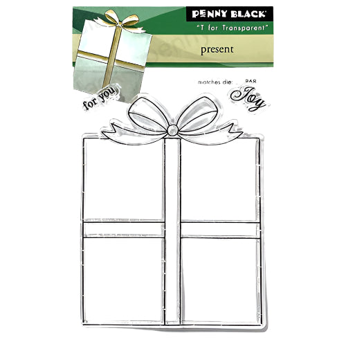 Penny Black Present Clear Stamps is a 3x4 inch clear stamp set featuring three stamps: a large wrapped gift box with ribbons and a bow, plus two festive sentiments. Pairs perfectly with the coordinating Present Cut Outs Die 51-868, sold separately.