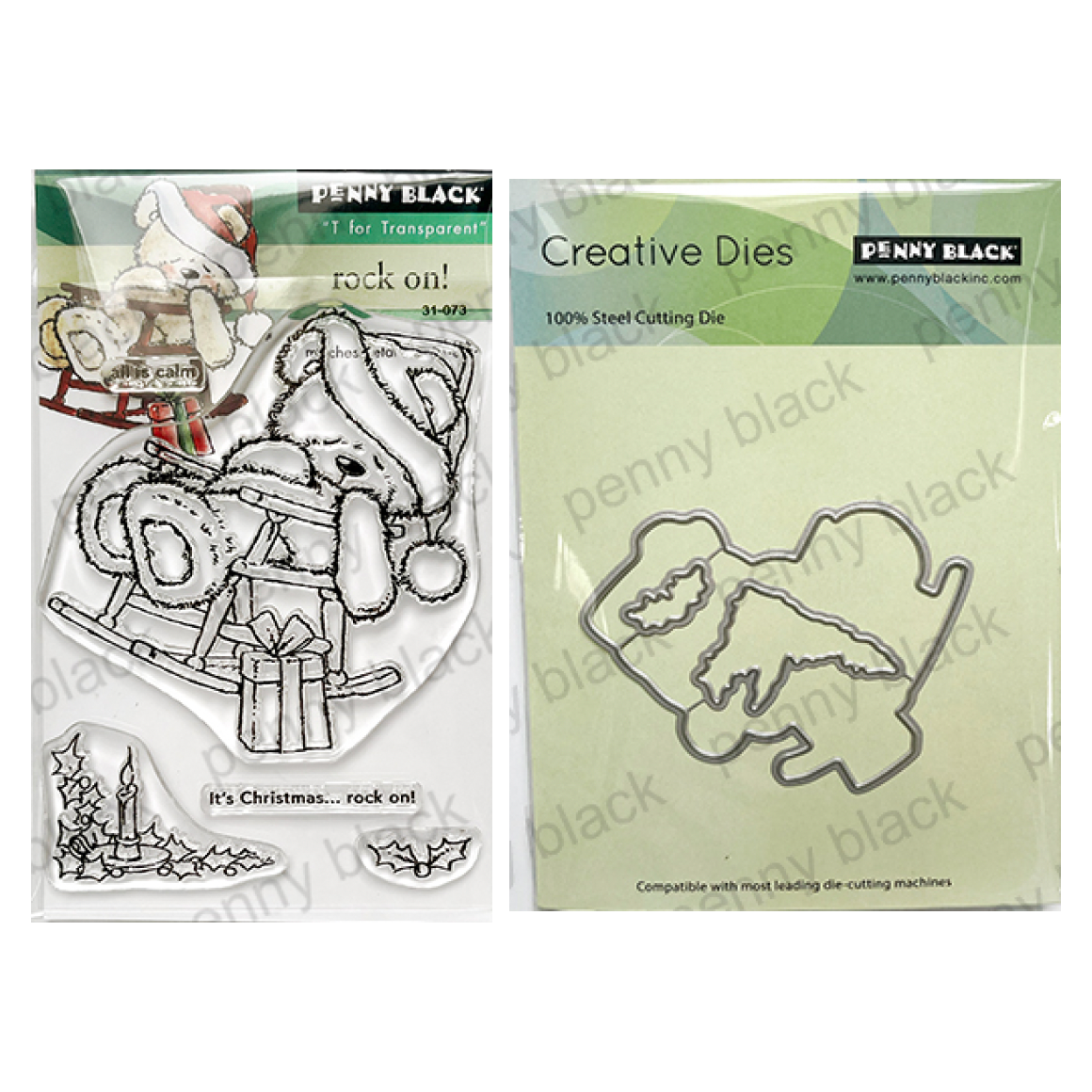 The Penny Black Rock On Clear Stamp and Die Set includes the 3x4 inch Rock On clear stamps 31-073 with four stamps and Rock On coordinating dies 51-837. The stamps feature an adorable teddy bear taking a snooze in a rocking chair wearing his Santa hat with a wrapped gift next to him, a corner embellishment of holly leaves and a lit candle, a small holly leaf set with a berry, and one sentiment. The coordinating dies allow you to add intricate cuts to your holiday projects, making it a perfect addition to your festive crafting collection.