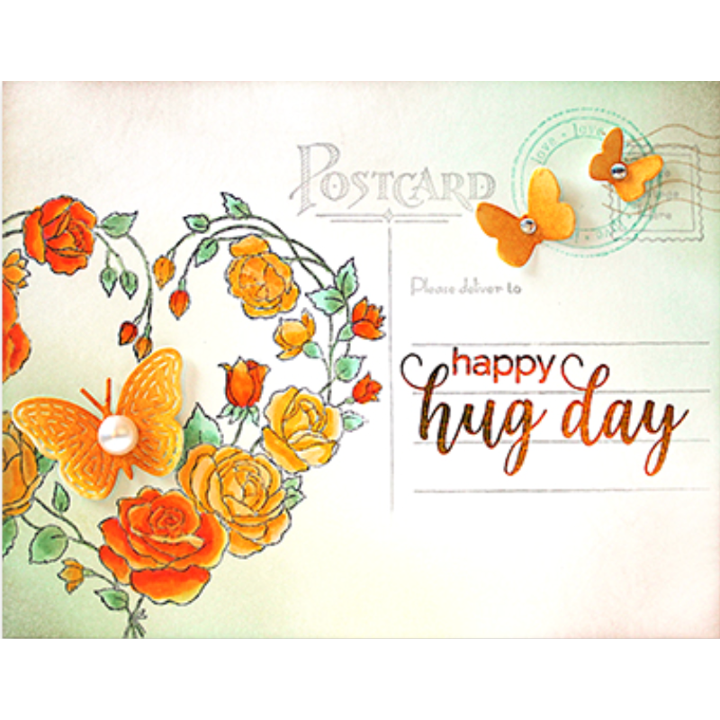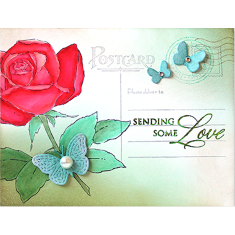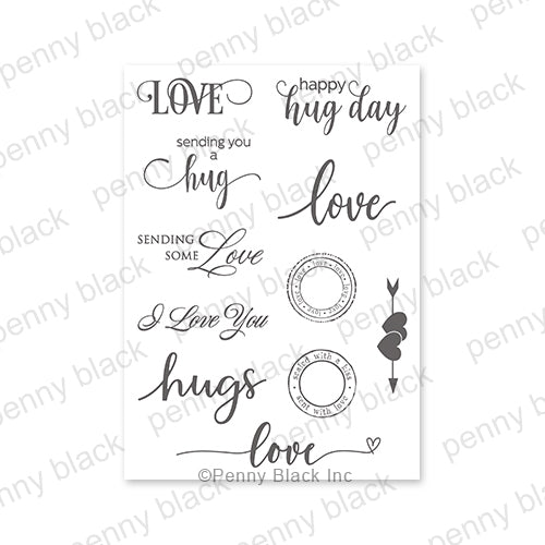 The Penny Black Shimmering Hugs Stick and Shine Sheets include two 5x7 inch sheets of delightful rub-on accents designed for foiling. This set features elements like hearts, postage stamps, and heartfelt sentiments.