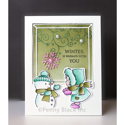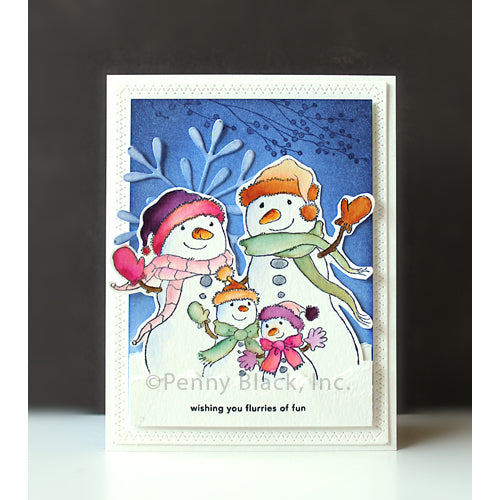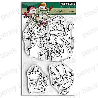 The Penny Black Snow Folks Clear Stamps set is a 4x6-inch collection featuring three charming winter-themed stamps. It includes a snowy family, a small snowman, and a child in a puffy winter coat reaching out to hug a snow friend. Coordinating Snow Folks Dies 51-855 are available separately, making it easy to create layered and dimensional designs for your holiday projects.