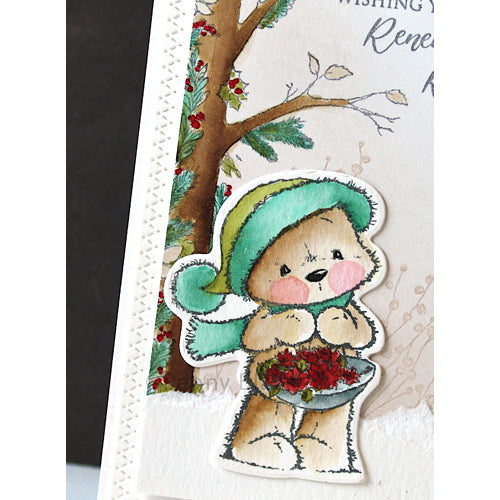 The Penny Black Sweet Christmas Clear Stamps is a 5 x 6.5-inch set featuring five delightful stamps. The designs include two trees adorned with wintery greens, a little bird, a bear wearing a scarf and hat while holding a basket of flowers, and a festive sentiment. Coordinating Sweet Christmas Cut Out Dies 51-840 are available separately, making it easy to enhance your seasonal projects with dimension and charm.