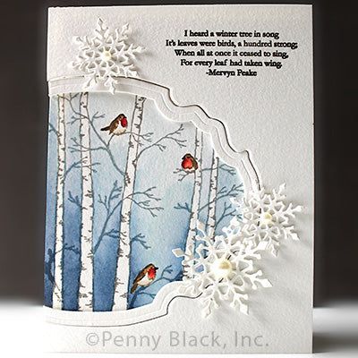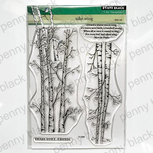 The 5 x 5.6 inch Take Wing Clear Stamp Set from Penny Black contains 4 stamps. It includes two stamps of birch tree groups in winter, with bare branches and exposed trunks, and two sentiment stamps.