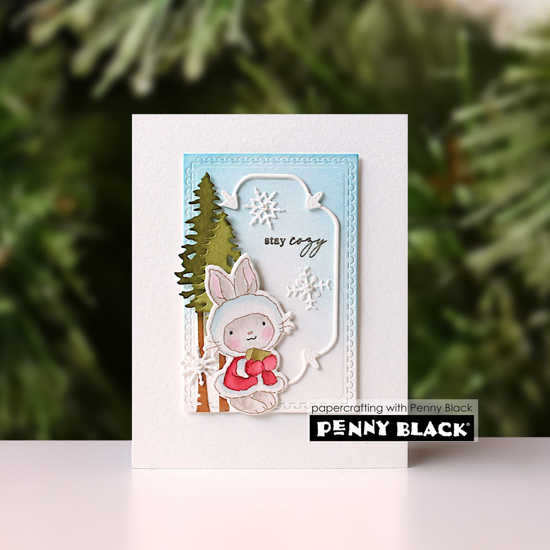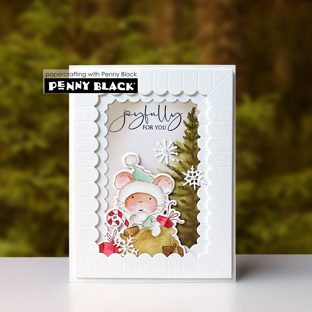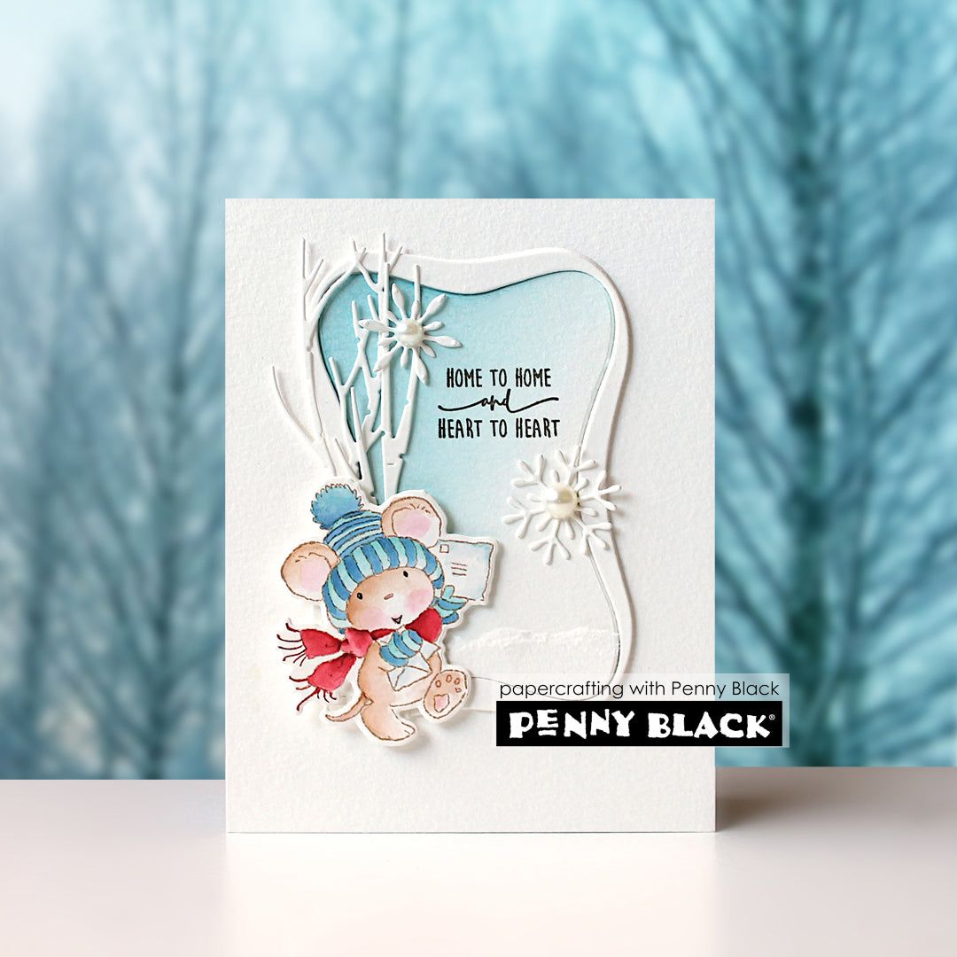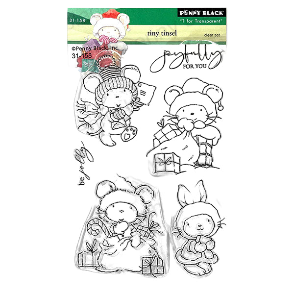 Penny Black Tiny Tinsel Clear Stamps is a 4x6 inch set featuring four adorable critters bundled up for winter and ready to celebrate the holidays. Images include characters walking letters to the post box and carrying sacks of gifts, along with two festive sentiments. Coordinates with the Tiny Tinsel Cut Out Dies 51-937, sold separately.