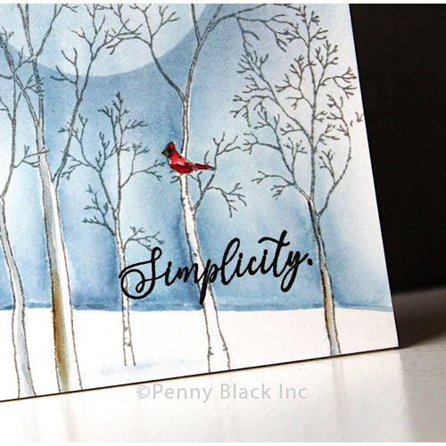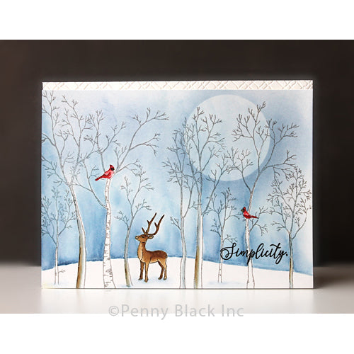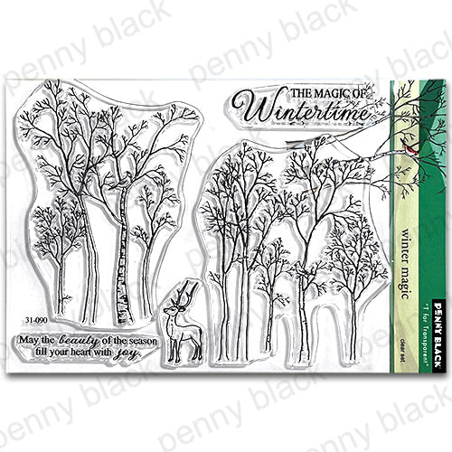 The Penny Black Winter Magic Clear Stamps is a 5 x 6.5-inch set featuring five stunning stamps. This set includes two wintery woodland scenes, a majestic buck, and two heartfelt sentiments, making it perfect for creating serene and elegant seasonal projects.