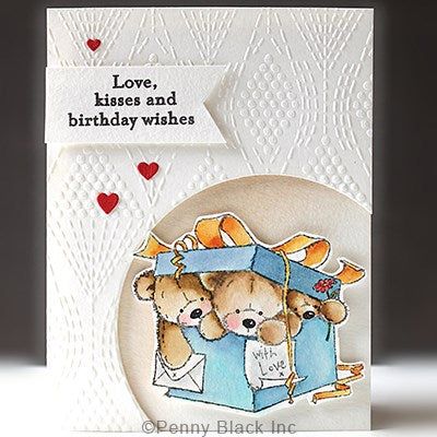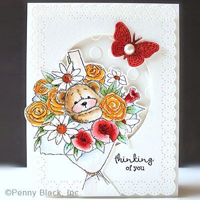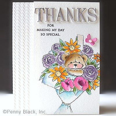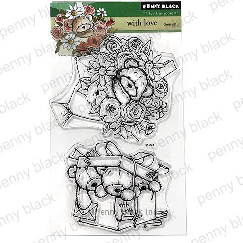 Introducing the Penny Black With Love Clear Stamps, a heartwarming 4x6 inch stamp set capturing the adorable antics of teddy bears spreading love and cheer! This charming collection features two delightful images: one showcasing a teddy bear nestled within a floral bouquet, and the other depicting three little bears being lovingly wrapped up in a box with a big bow. Whether you're crafting cards, gift tags, or other paper crafts, these stamps offer endless creative possibilities for conveying affection and warmth. Let your creativity blossom with the Penny Black With Love Clear Stamps!