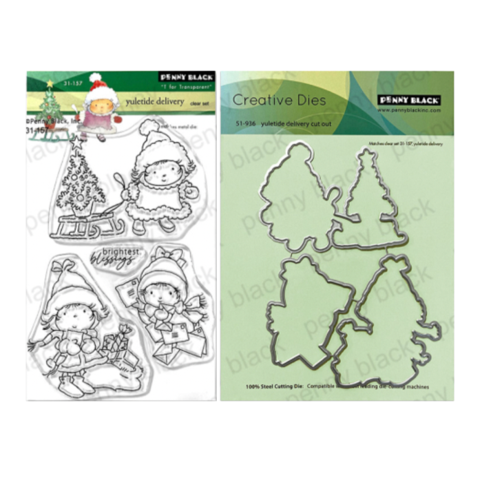 Penny Black Yuletide Delivery Clear Stamp and Die Set includes the 4x6 inch Yuletide Delivery Clear Stamps 31-157 and the coordinating Yuletide Delivery Cut Out Dies 51-936. This charming set features three festive images of a child in winter clothing—pulling a sled with a decorated tree, mailing letters, and standing with a pile of gifts—along with one coordinating sentiment. The die set includes four outline dies that perfectly match the stamped images, making it easy to add dimension to your holiday projects. Compatible with most leading die-cutting machines, this set is perfect for creating warm and cheerful seasonal designs.