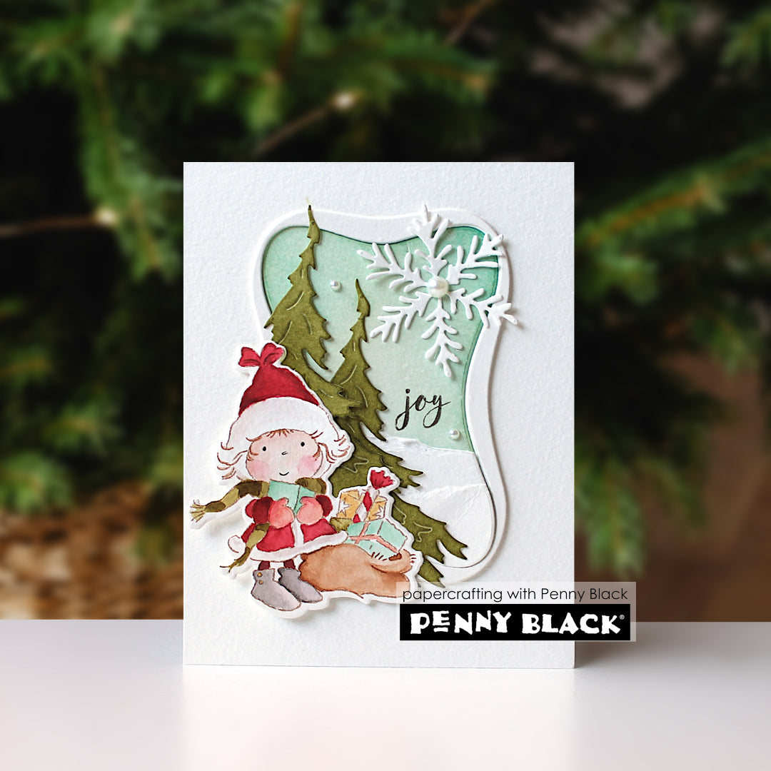 Penny Black Yuletide Delivery Clear Stamps is a 4x6 inch set featuring three heartwarming images of a child dressed in winter clothing, pulling a sled with a decorated tree, mailing letters, and standing with a pile of gifts, along with one coordinating sentiment. Pairs with the Yuletide Delivery Cut Out Dies 51-936, sold separately.