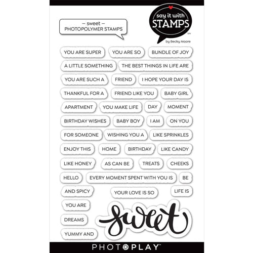 This package contains a set of 40 photopolymer stamps in a 4 inch x 6 inch package. Made in the USA. Large word measures 2.5 inches x 1 inch and sentiments measure .09 inches tall.