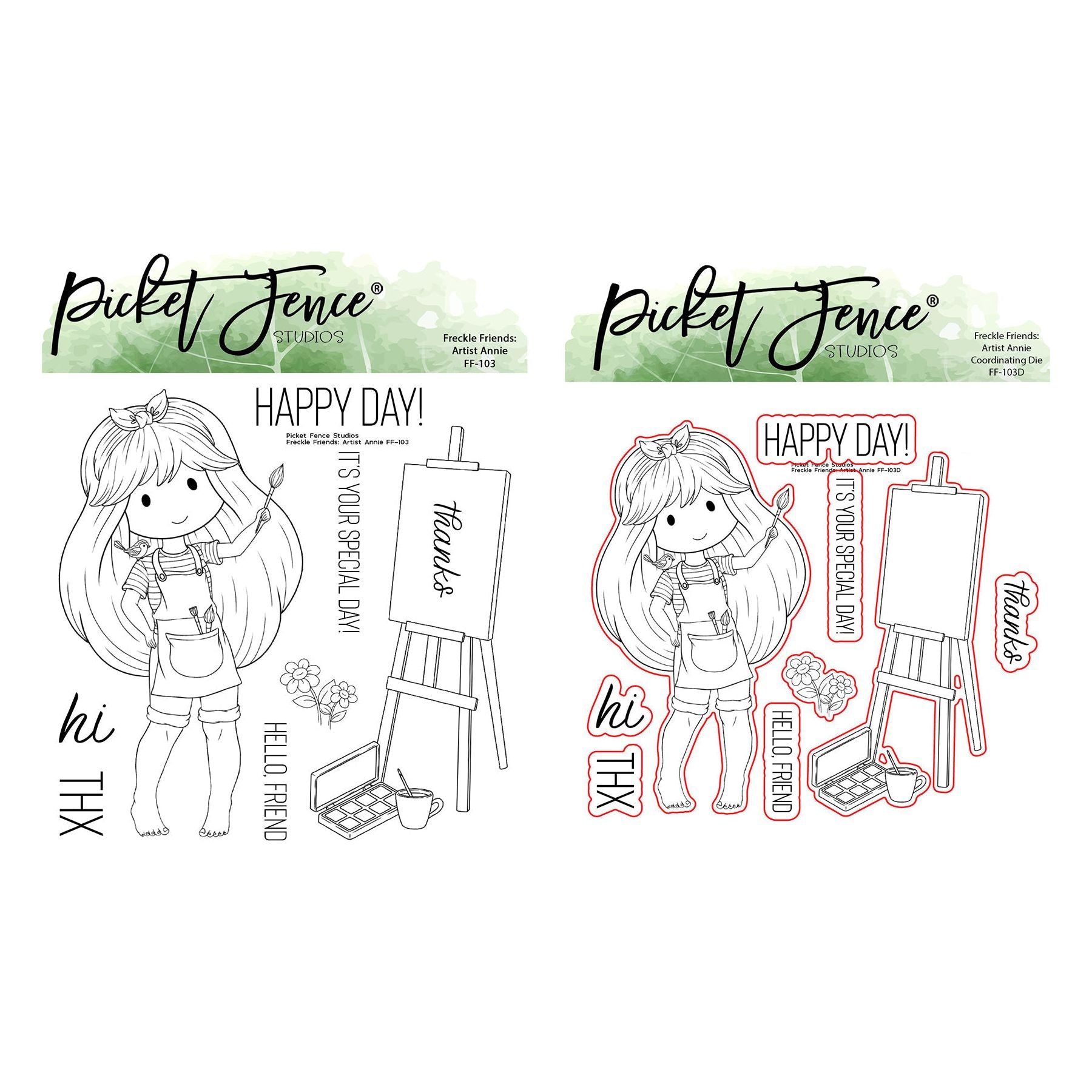 The Picket Fence Studios Artist Annie Stamp and Die Bundle includes the Artist Annie Clear Stamps ff-103 and Artist Annie Dies ff-103d. The 4 x 4-inch photopolymer stamp set features 9 pieces, including Annie, dressed in shorts, a tee shirt, and an apron, with a bow in her long hair. She is barefoot, holding a paintbrush, ready to create on her canvas and easel. The sentiments included are "Happy Day," "thanks," "It’s your special day," "hi," "THX," and "Hello Friend." The Annie stamp measures approximately 2.93 x 3.71 inches, and the included dies cut out each piece perfectly.