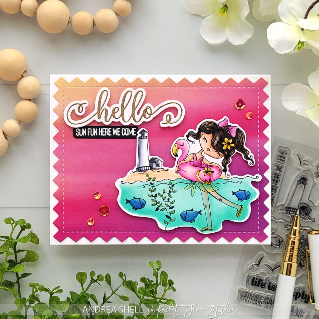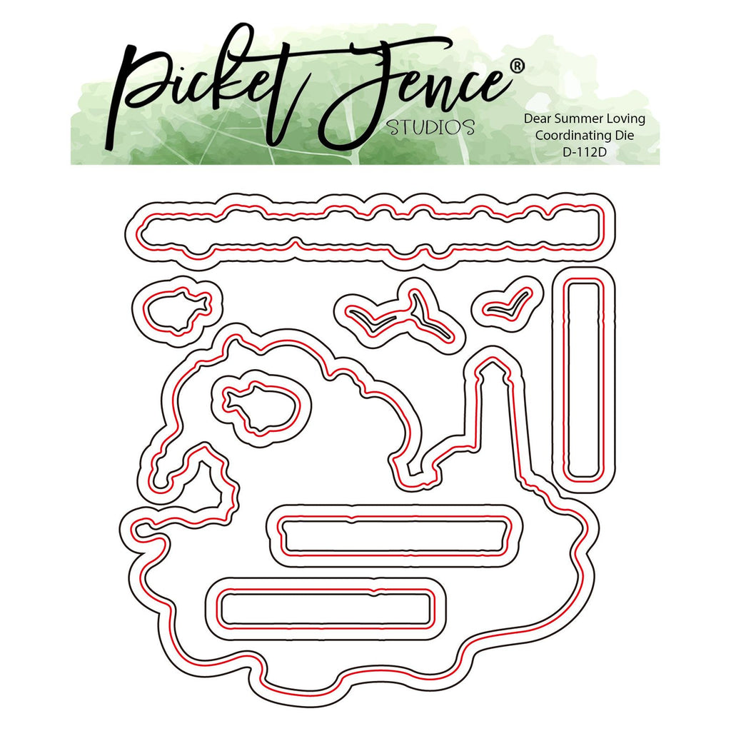 The Picket Fence Studios Dear Summer Loving Dies, part of the Dear Collection, offer a versatile array of die-cut shapes that perfectly complement the Dear Summer Loving Clear Stamps d-112. This 4 x 4-inch wafer-thin die set includes 9 pieces designed to bring your summer-themed creations to life with ease and precision. At the heart of the set is the main die featuring a charming scene of a girl wading in water, adorned with her bathing suit and wearing a flamingo inner tube. Beneath the surface, you'll find an assortment of delightful elements, including fish swimming among bubbles and seaweed, as well as additional fish, birds in flight, and a lighthouse, adding depth and detail to your projects. The sentiments capture the spirit of summer with phrases like "Life is a beautiful thing," "You make summer a blast," "Life is better with you," and "Sun Fun here we come." These versatile dies are compatible with most die-cutting machines.