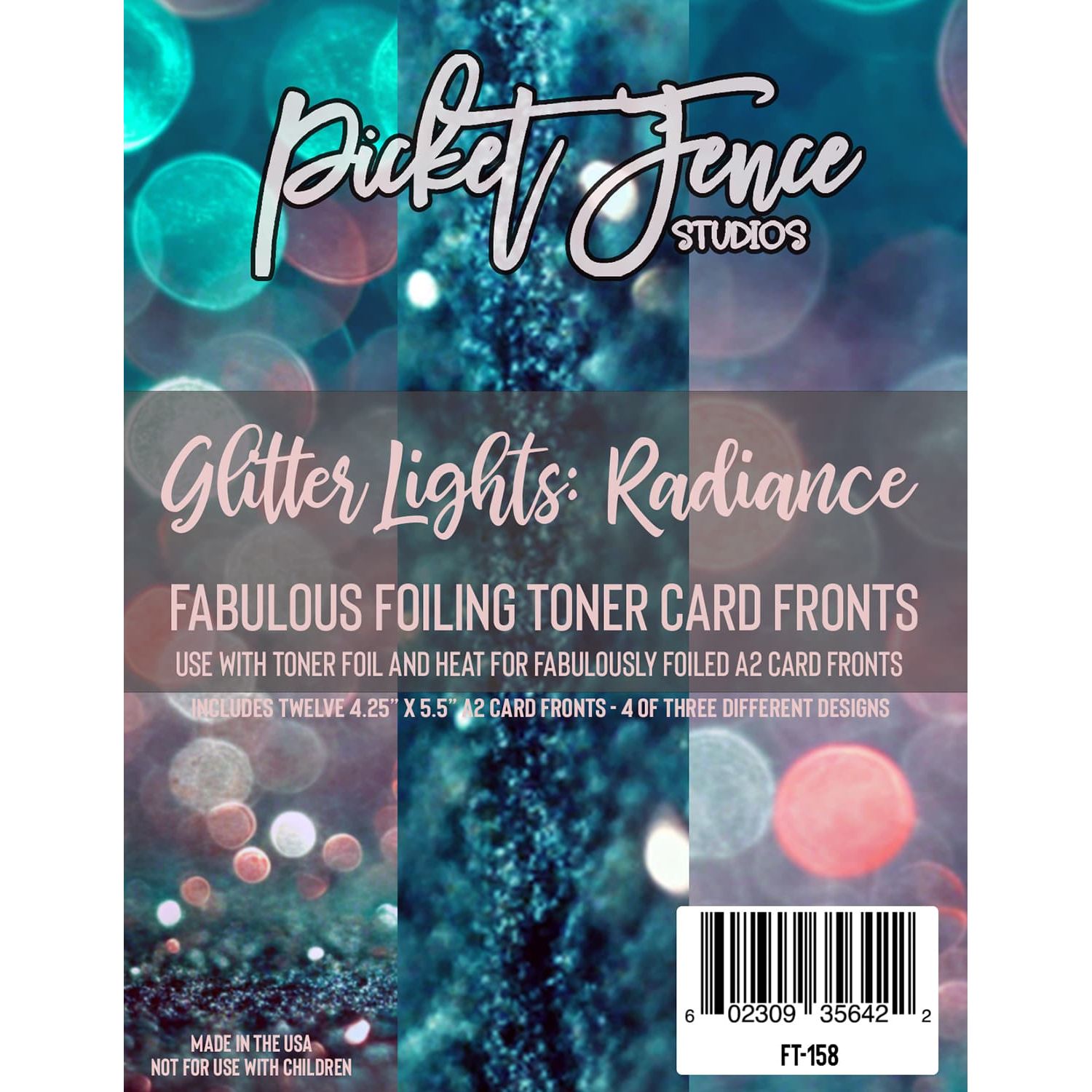 Picket Fence Studios Fabulous Foiling Toner A2 Card Fronts Glitter Lights Radiance includes four each of three different designed A2 Card Fronts (4.25 x 5.5 inches) for a total of 12 on 90 lb white card stock. The toner foil "trash" leftover from foiling these beautiful card fronts can be used with Fabulous Foiling Toner 8.5 x 11 Card Stock packs to create two-for-one card backgrounds. For use with direct application of toner foil. Works with Minc and most laminators. The designs feature a blurry closeup of shimmering teals, maybe glitter or confetti.