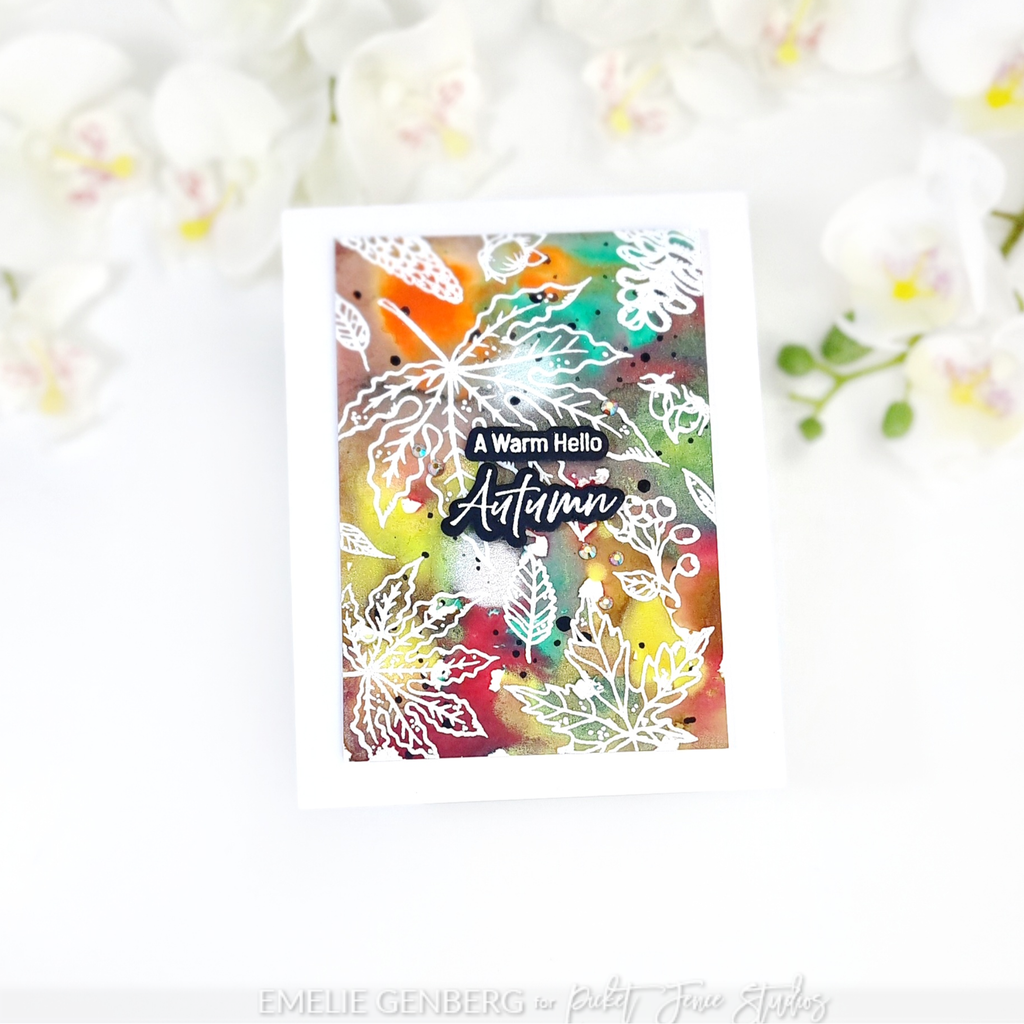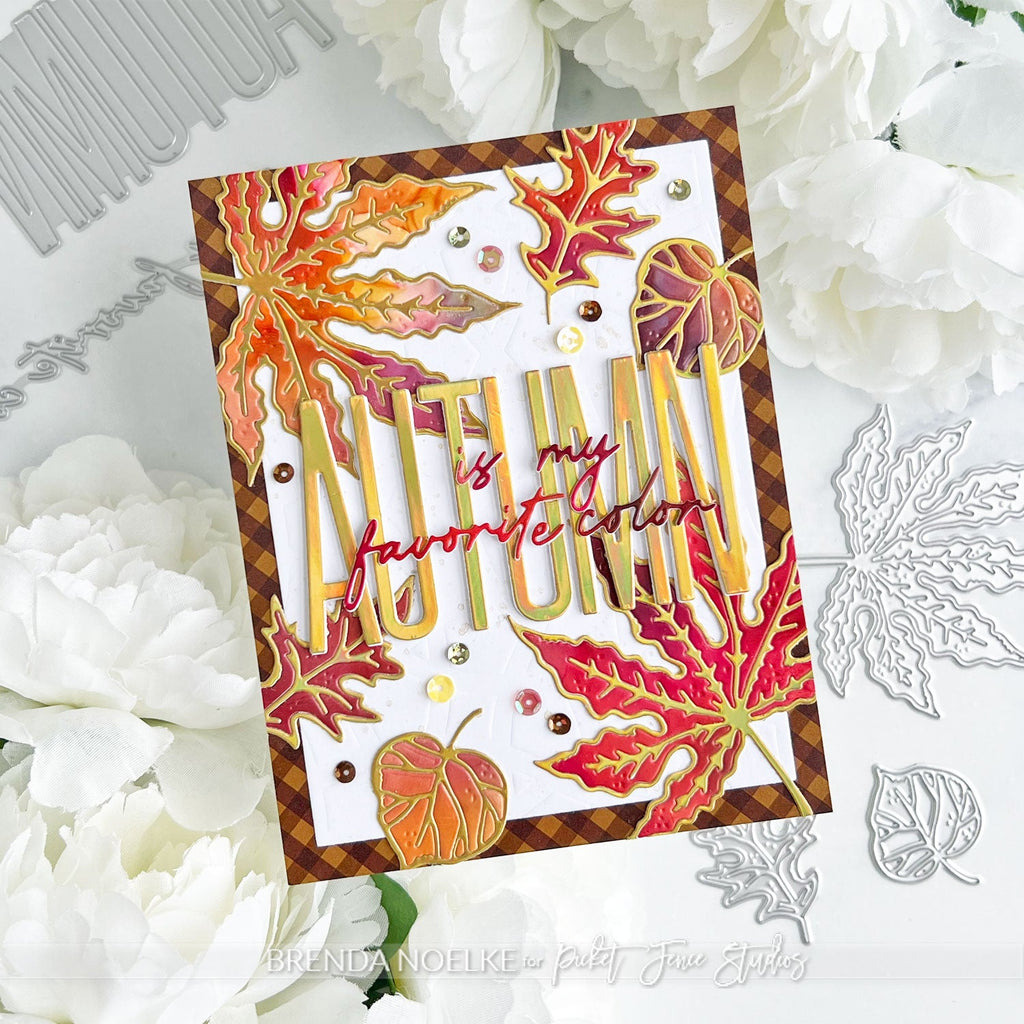 Picket Fence Studios Leaves Falling for You Clear Stamps are part of the Floral Collection. This 5 x 5-inch photopolymer clear stamp set features 15 pieces, showcasing various leaves, pinecones, berries, and other greenery, along with the sentiment "Autumn Greetings." The set coordinates with the Leaves Falling for You Dies (f-195d).
