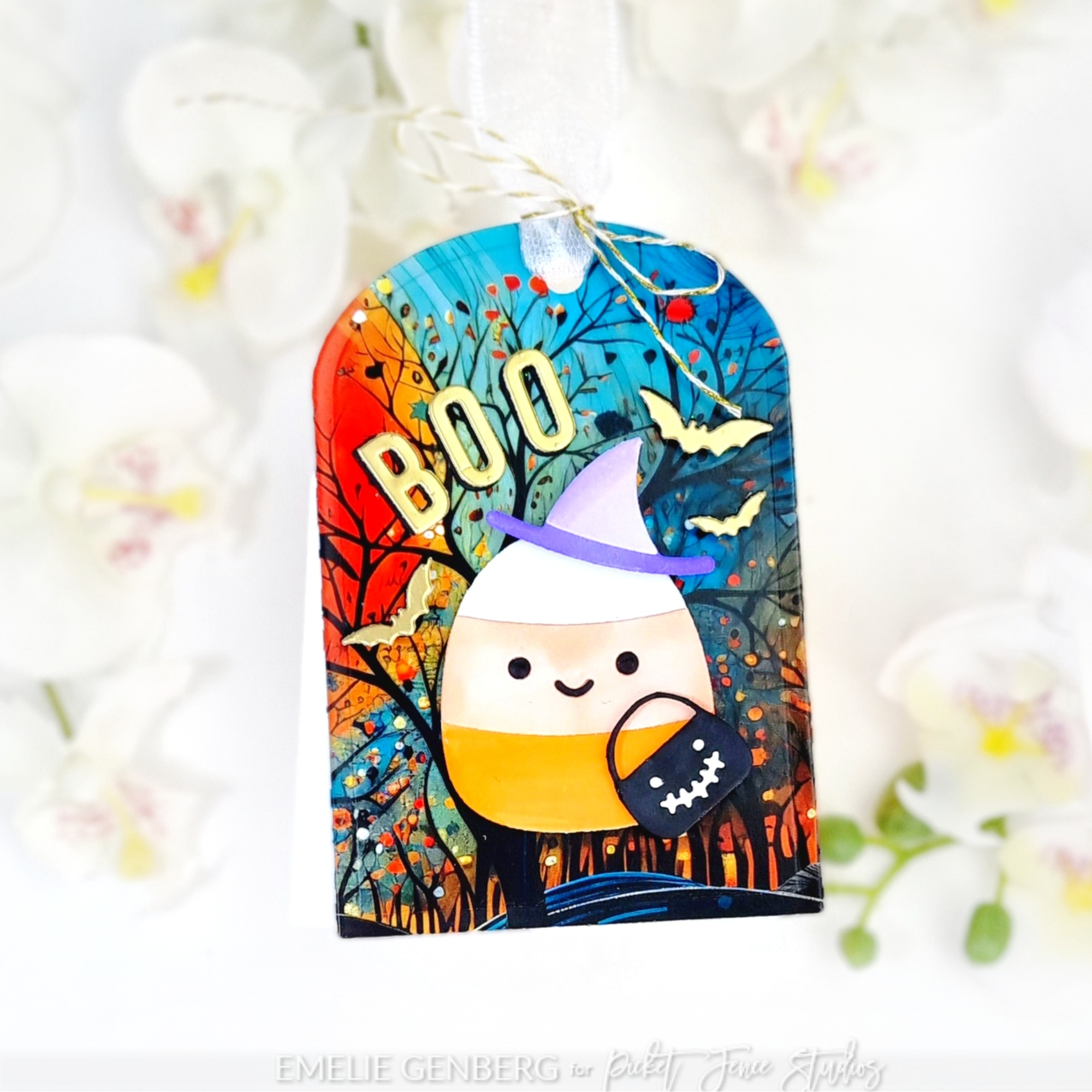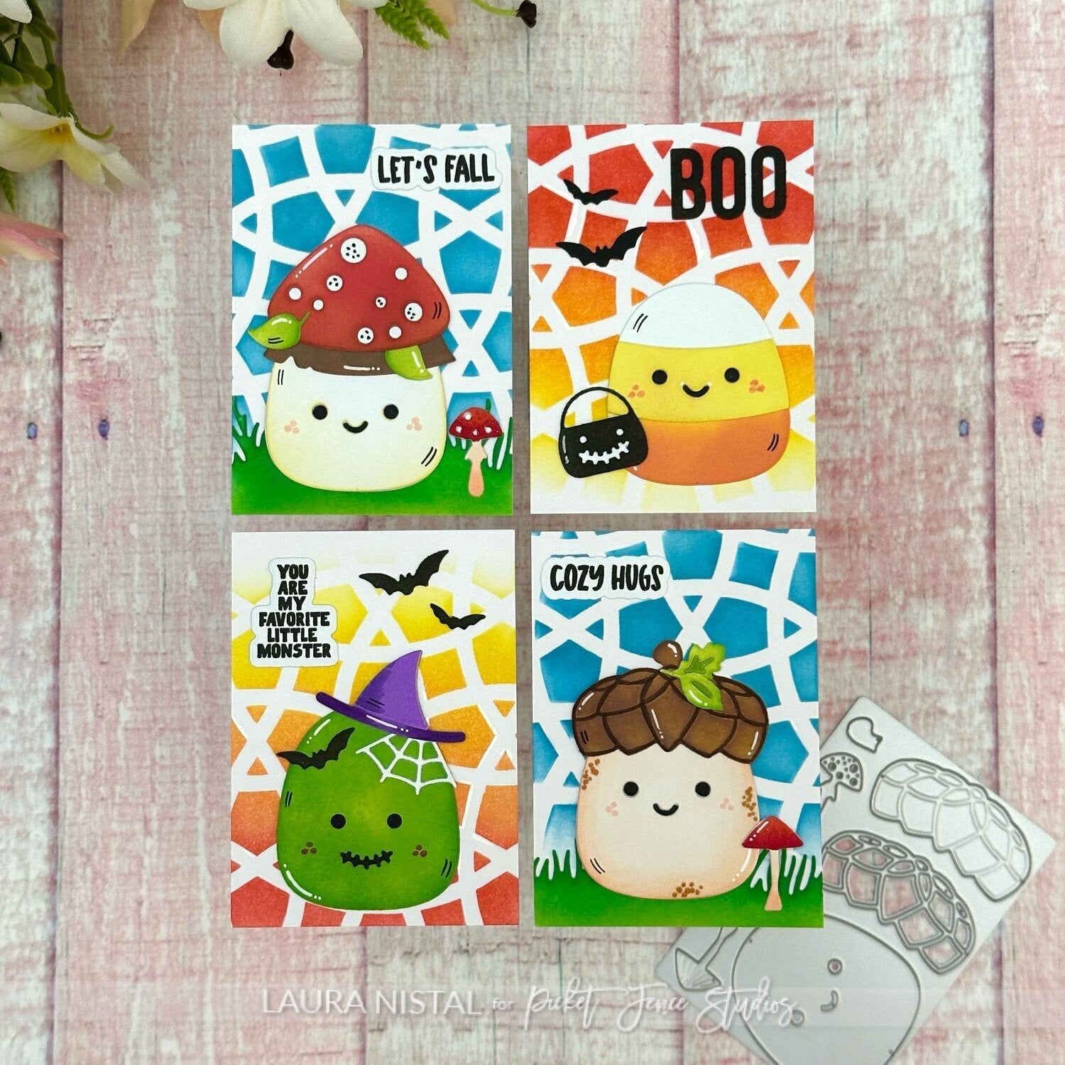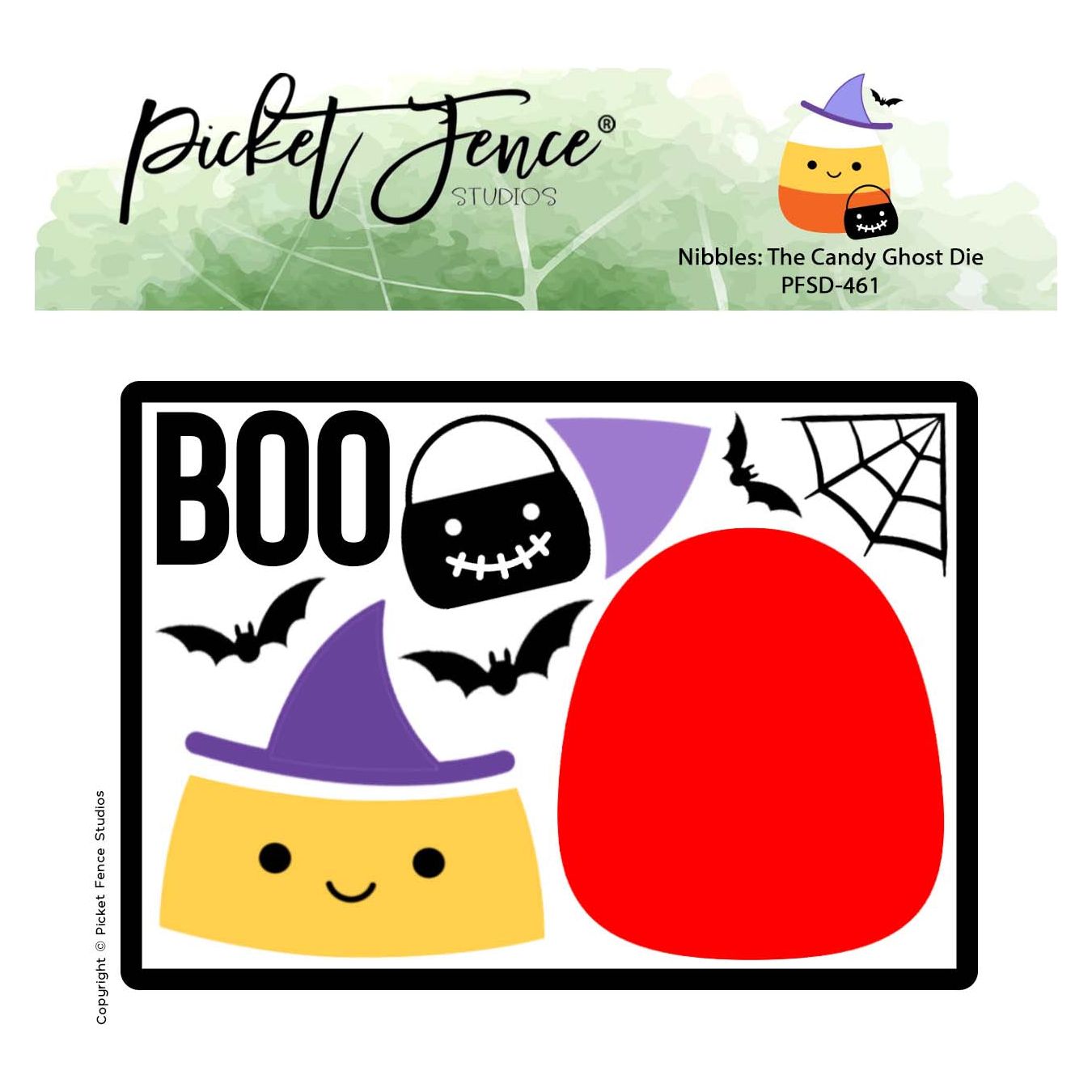The Picket Fence Studios Nibbles: The Candy Ghost Dies are versatile and compatible with most die-cutting machines. When assembled, this set measures approximately 3.45 x 2.42 inches. It allows you to create an adorable candy corn character with a cheerful face. Additionally, you can accessorize with items like a witch's hat, a treat basket, bats, spiderwebs, and the word "Boo."