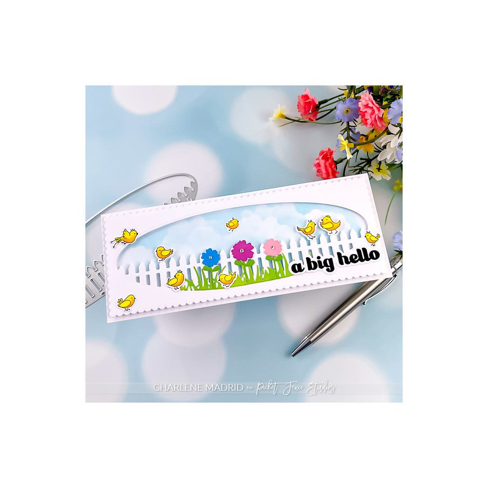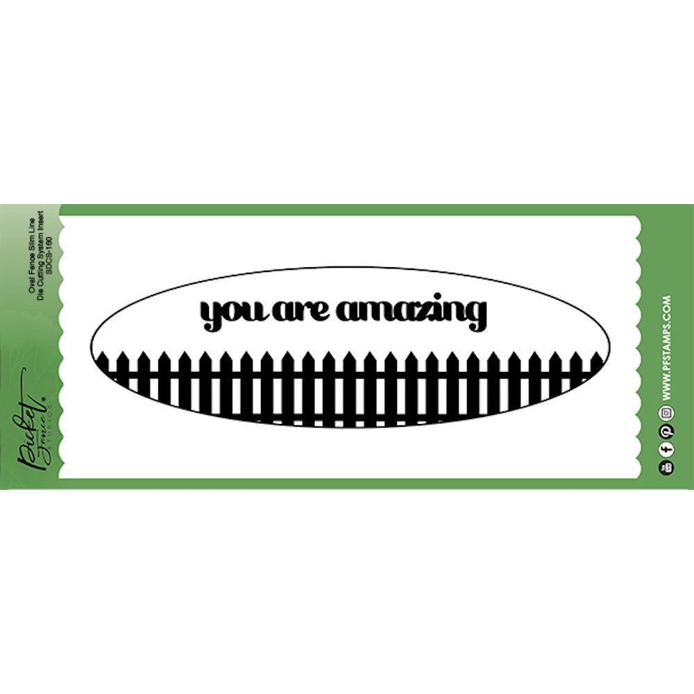 The Picket Fence Studios Oval Fence Slim Line Die Cutting System Insert is a 4 x 10-inch wafer-thin die set that includes 4 pieces. The oval shape is approximately 8.21 x 3.22 inches in size and features a picket fence design inside, along with the words "You are Amazing". This slimline die-cutting system insert is perfect for creating a beautiful and intricate design for your paper crafting projects. The Oval Fence Slim Line Die Cutting System Insert is compatible with most die-cutting machines, making it easy to add a touch of charm and inspiration to your cards, scrapbook pages, or other paper crafts.