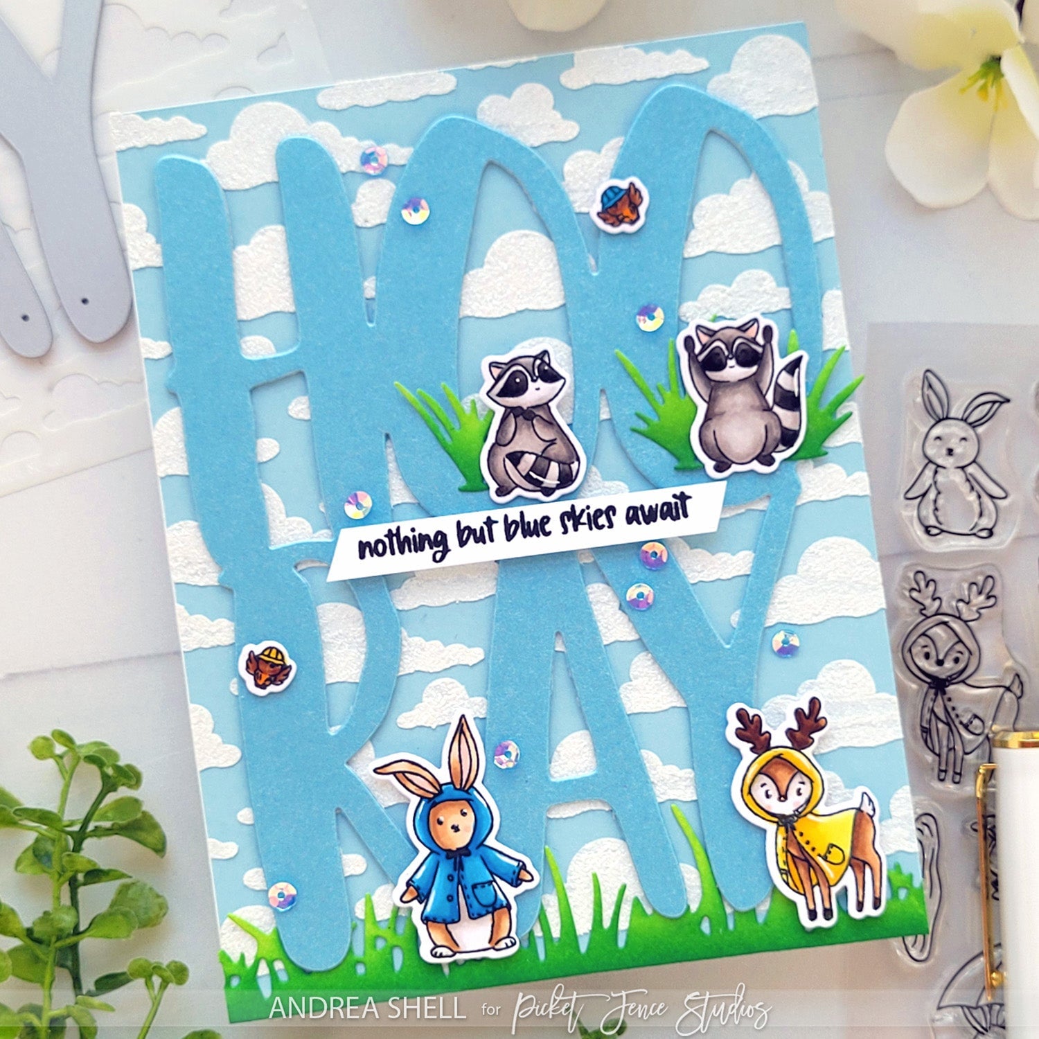 The Picket Fence Studios Peach and Piper Bad Weather Friends Bundle includes both the Peach and Piper Bad Weather Friends Clear Stamps pap-101 and coordinating dies pap-101d. Each set measures 4 x 6 inches and contains 21 pieces. This charming stamp set features sweet animals, including bunny rabbits in raincoats and under umbrellas, deer, raccoons, and birds with rain hats, as well as puddles to set the scene for rainy-day adventures. Sentiments include "Gray skies bring sunny days," "Thank you for your love and support, my friend," "I always have my listening ears on for you," "Playing in the rain can help the blues go away," "Some of the best things in life are free," and "Have a nice day." The coordinating dies ensure precision cutting for each stamp, making this set ideal for heartfelt and cheerful creations.