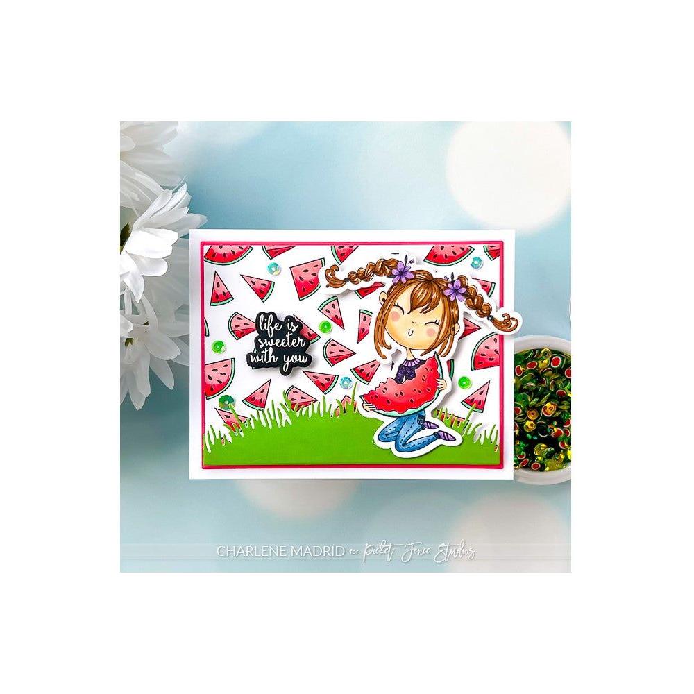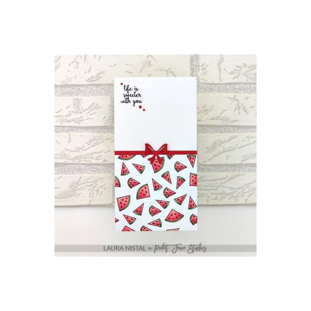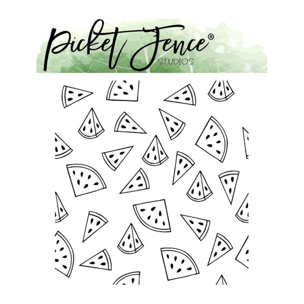 The Picket Fence Studios Watermelon Nectar Clear Stamp is a part of the Building Backgrounds collection. This clear stamp set measures 4 x 4 inches and features a background design of watermelon slices.