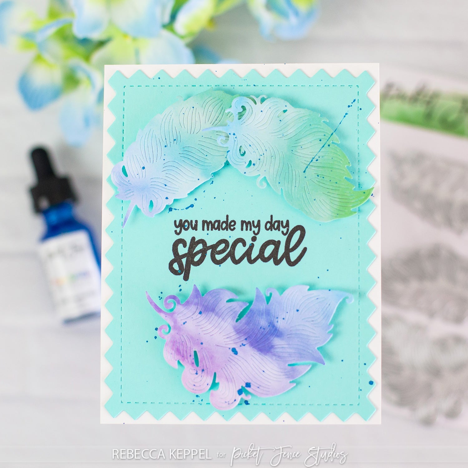 Picket Fence Studios Wreath Building: Feathers Clear Stamps, part of the Florals Collection, offer a versatile and creative addition to your crafting supplies. This 4 x 5-inch, clear photopolymer stamp set includes 24 stamps. Among the stamps are various styles of bird feathers, plumes, and quills, ranging from plain to polka dot, stripes, and dipped designs. Additionally, tiny twigs are included in the set. These stamps can be used individually to create unique designs, or they can be combined to create beautiful wreaths by stamping in a rotating pattern. The set also includes sentiments to add a heartfelt touch to your projects, including "You made my day special" and "You are magical."