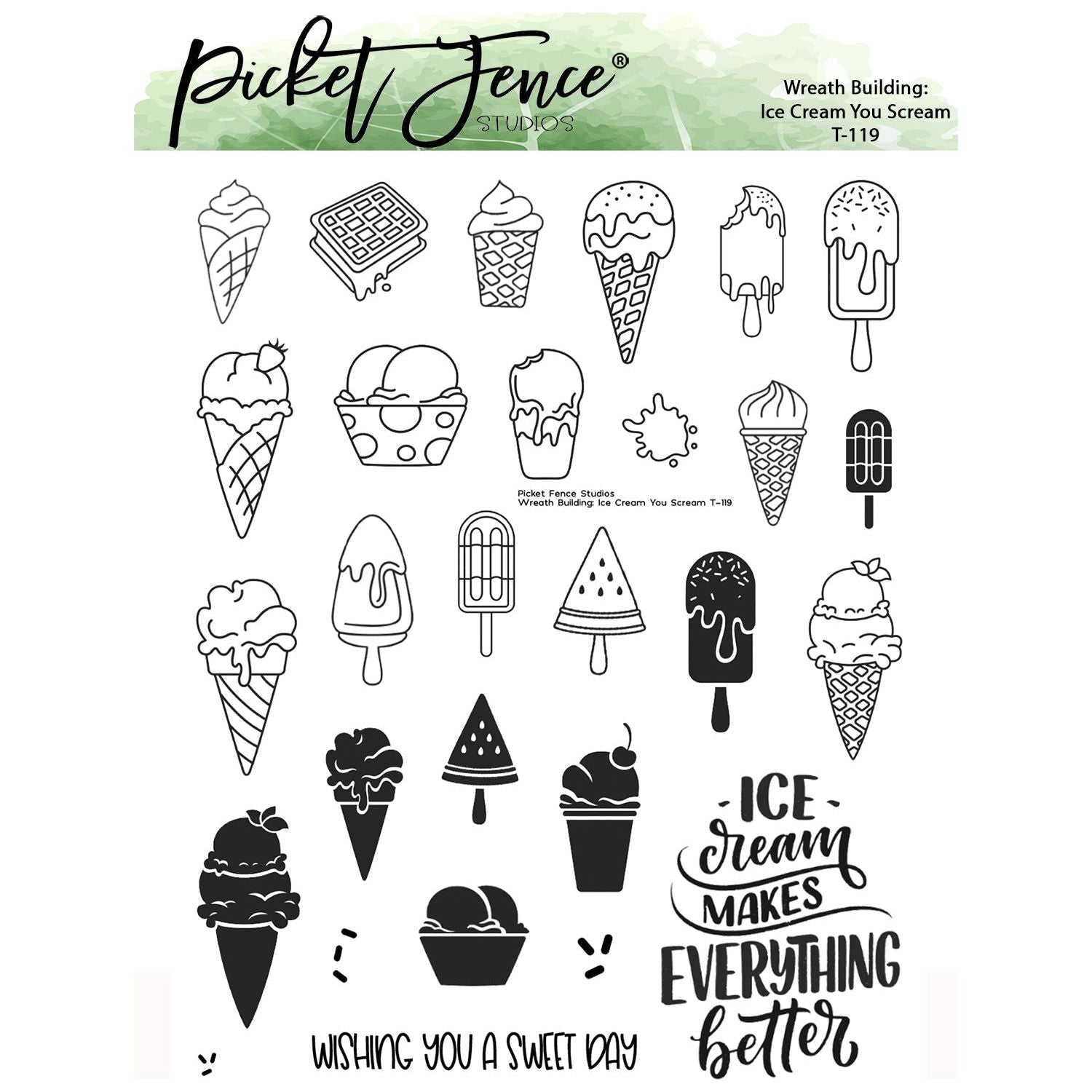 Picket Fence Studios Wreath Building: Ice Cream You Scream Clear Stamps are from the Treats Collection. This 4 x 5-inch clear photopolymer stamp set includes 27 pieces, featuring different styles of ice cream cones, milkshakes, popsicles, fudge bars, ice cream sandwiches, spills, and sprinkles. Sentiments like "Ice cream makes everything better" and "wishing you a sweet day" add a delightful touch. These versatile stamps enable you to create wreath-style images using the diverse elements provided.