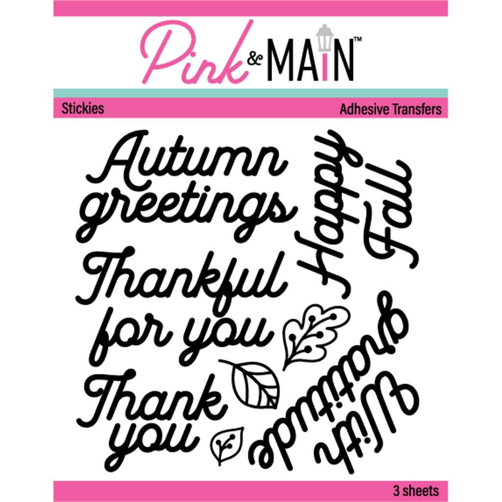 Presenting the Pink and Main Autumn Greetings Adhesive Transfer Stickies. Included in this package are 3 sheets of adhesive transfers. These function similarly to rub-ons, but with a unique twist – the designs possess a sticky quality. This allows you to enhance them with foil, glitter, flock, or embossing powder, providing a distinct appearance with each application. These stickies are perfectly aligned with the Autumn Greetings dies, offering seamless coordination for your creative projects.