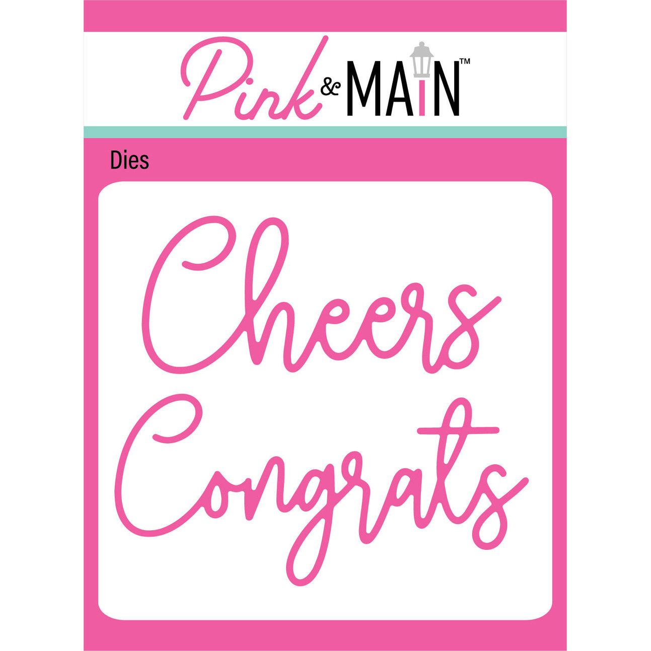 The Pink and Main Cheers Word Dies set includes 2 dies featuring the words Cheers and Congrats. The Cheers die measures approximately 3 x 1.5 inches, while the Congrats die measures approximately 3.5 x 1.875 inches.