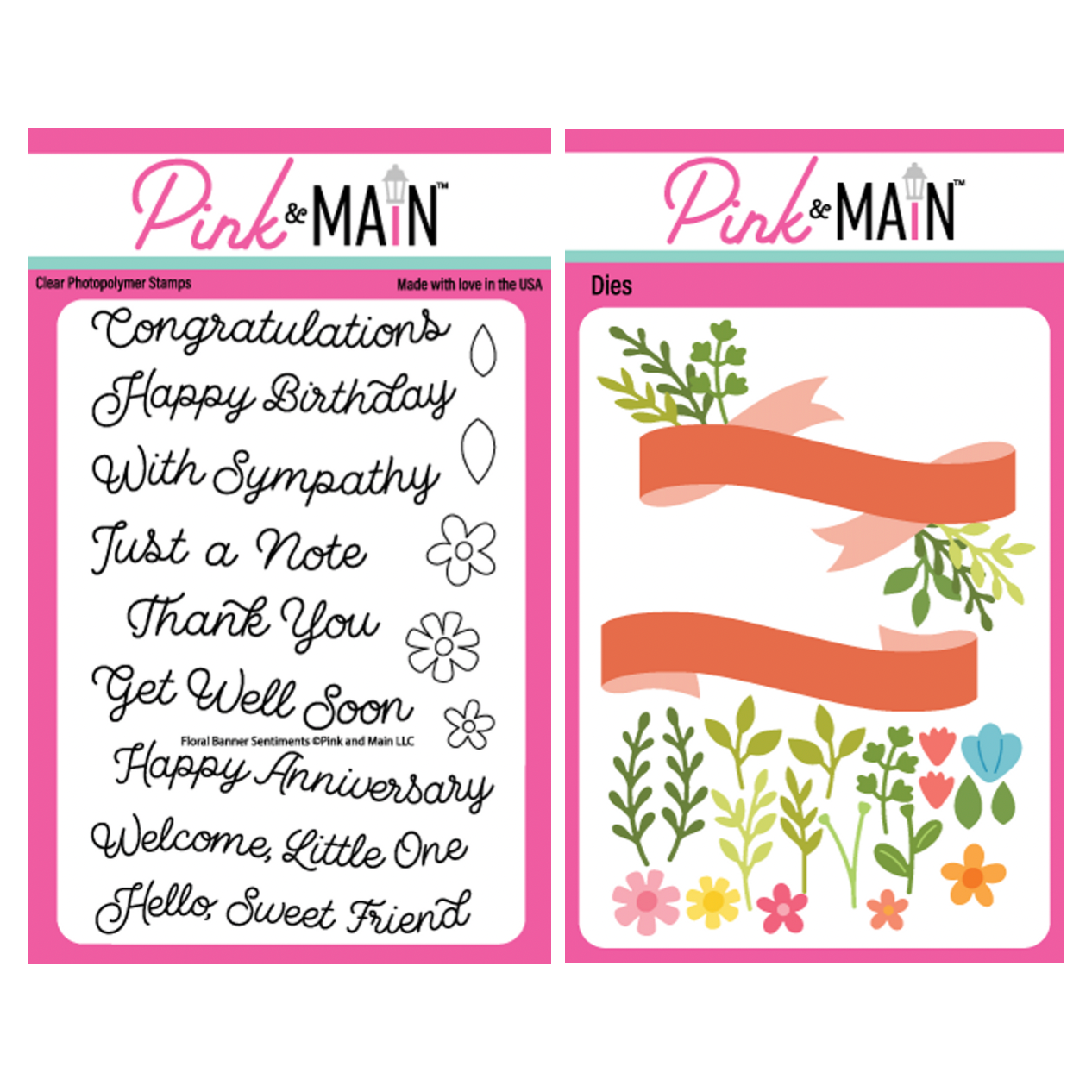 The Pink and Main Floral Banner Sentiments Clear Stamp and Floral Banner Die Set is a versatile and delightful addition to your crafting collection. The 4x6 inch stamp set includes 9 sentiments and 5 flower or leaf accents, perfect for various occasions. These stamps pair beautifully with the Floral Banner Dies PNM662, which cut two ribbon banner shapes along with all the floral designs. Compatible with popular die cutting machines like the Big Shot, Spellbinders Platinum, and Gemini, this set enables you to create stunning, coordinated projects effortlessly.