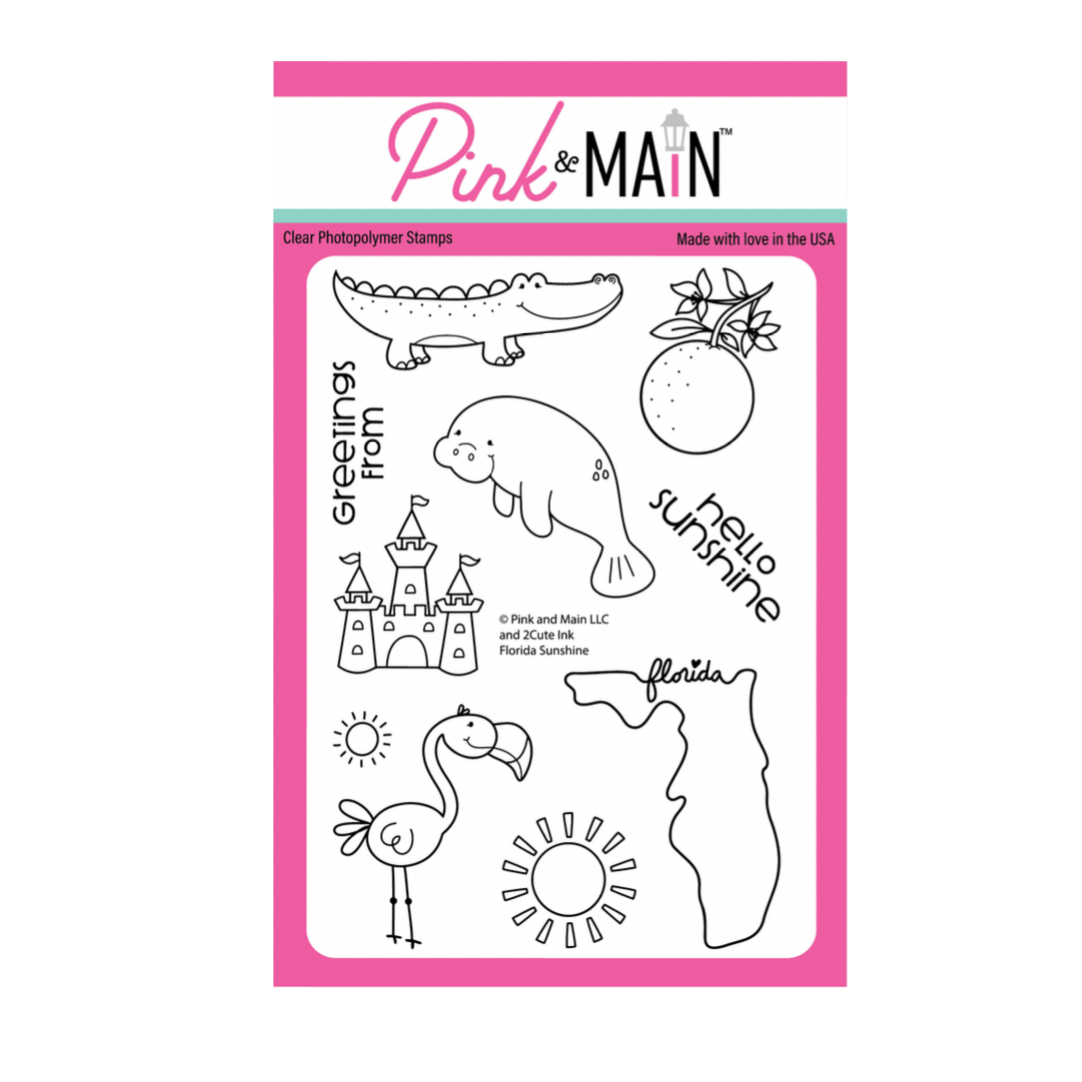 The Pink and Main Florida Sunshine Clear Stamps is a 4x6 inch set celebrating the sunshine state. It features the outline of Florida, an orange on a branch, flamingo, alligator, manatee, sandcastle, two sun designs, and two coordinating sentiments—perfect for capturing travel memories or creating Florida-themed cards. Pairs with the Florida Sunshine Dies PNM764, sold separately.