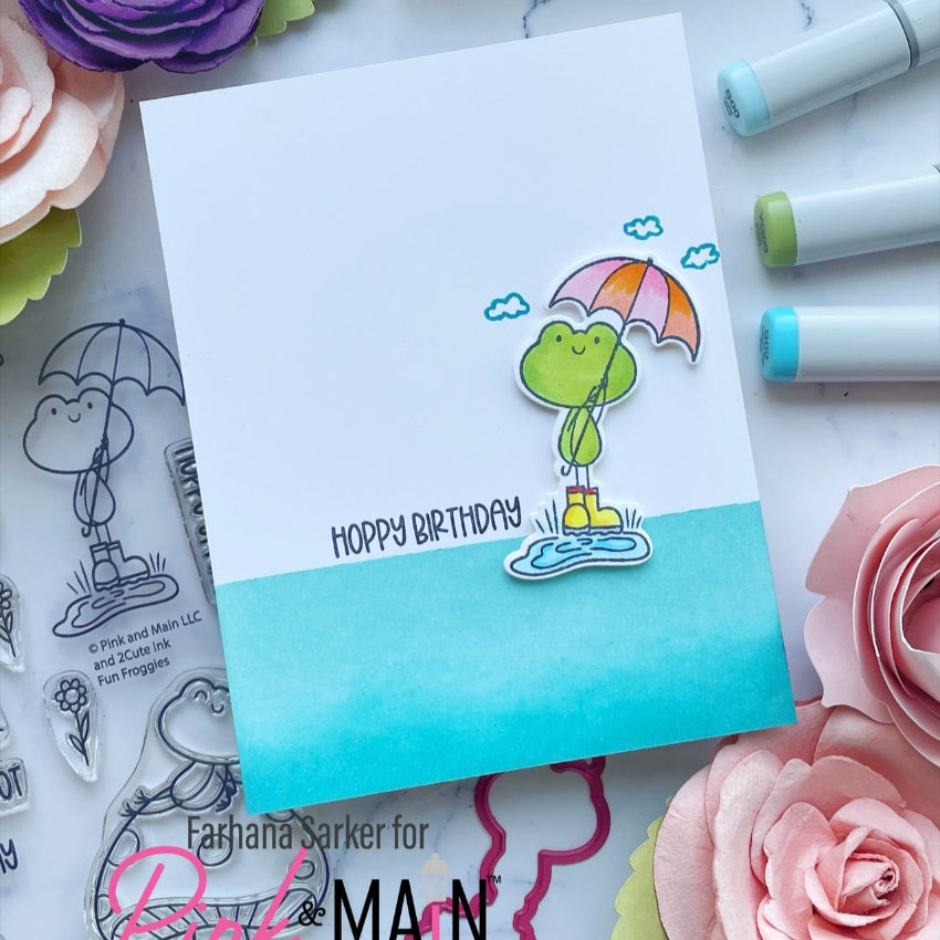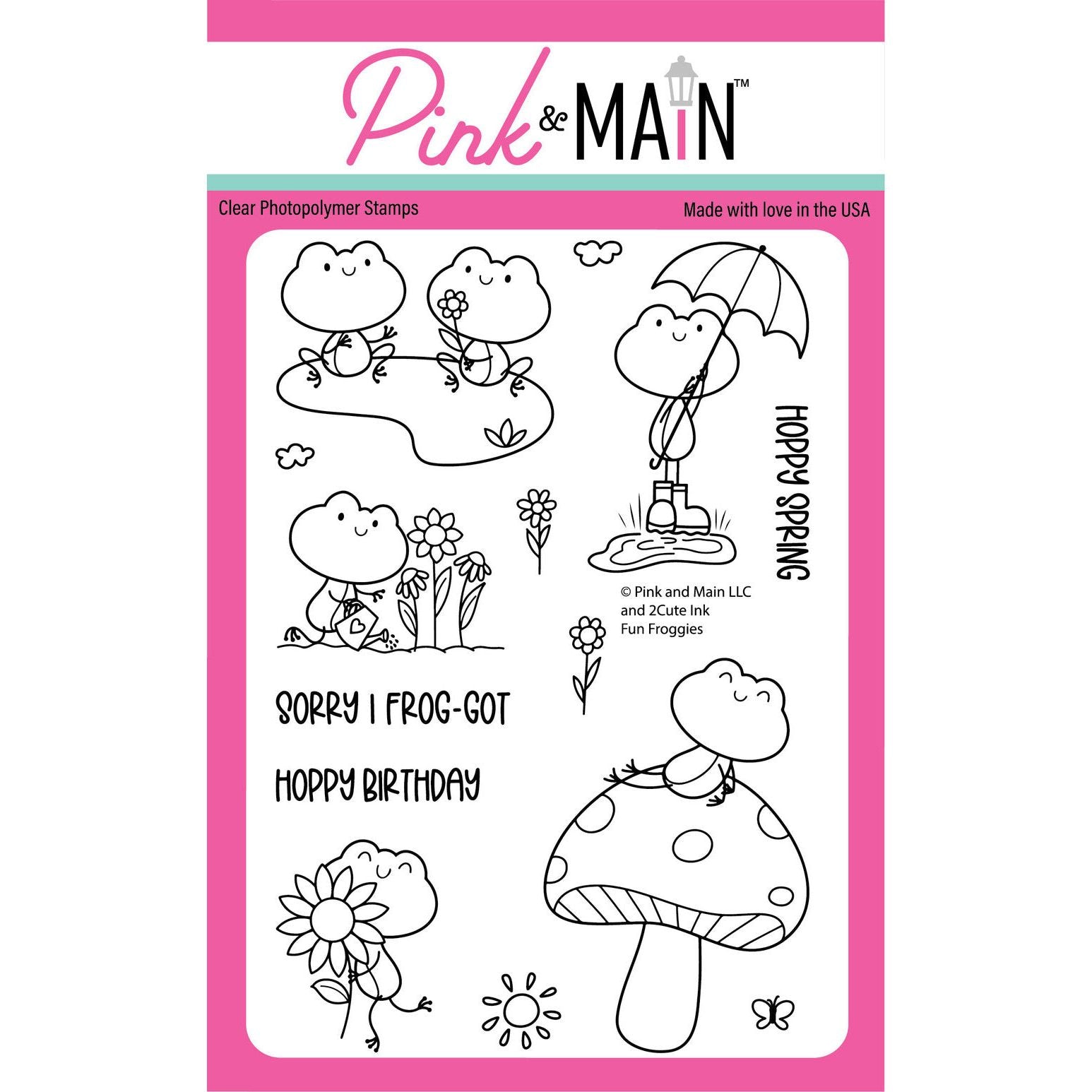 Pink and Main Fun Froggies Clear Stamps is a 4x6 inch set featuring five adorable frog images, along with six scene-building elements like clouds, flowers, a butterfly, and a sun. It also includes three coordinating sentiments. Made in the USA from high-quality photopolymer for crisp impressions. Coordinates with Fun Froggies Dies PNM746, sold separately.