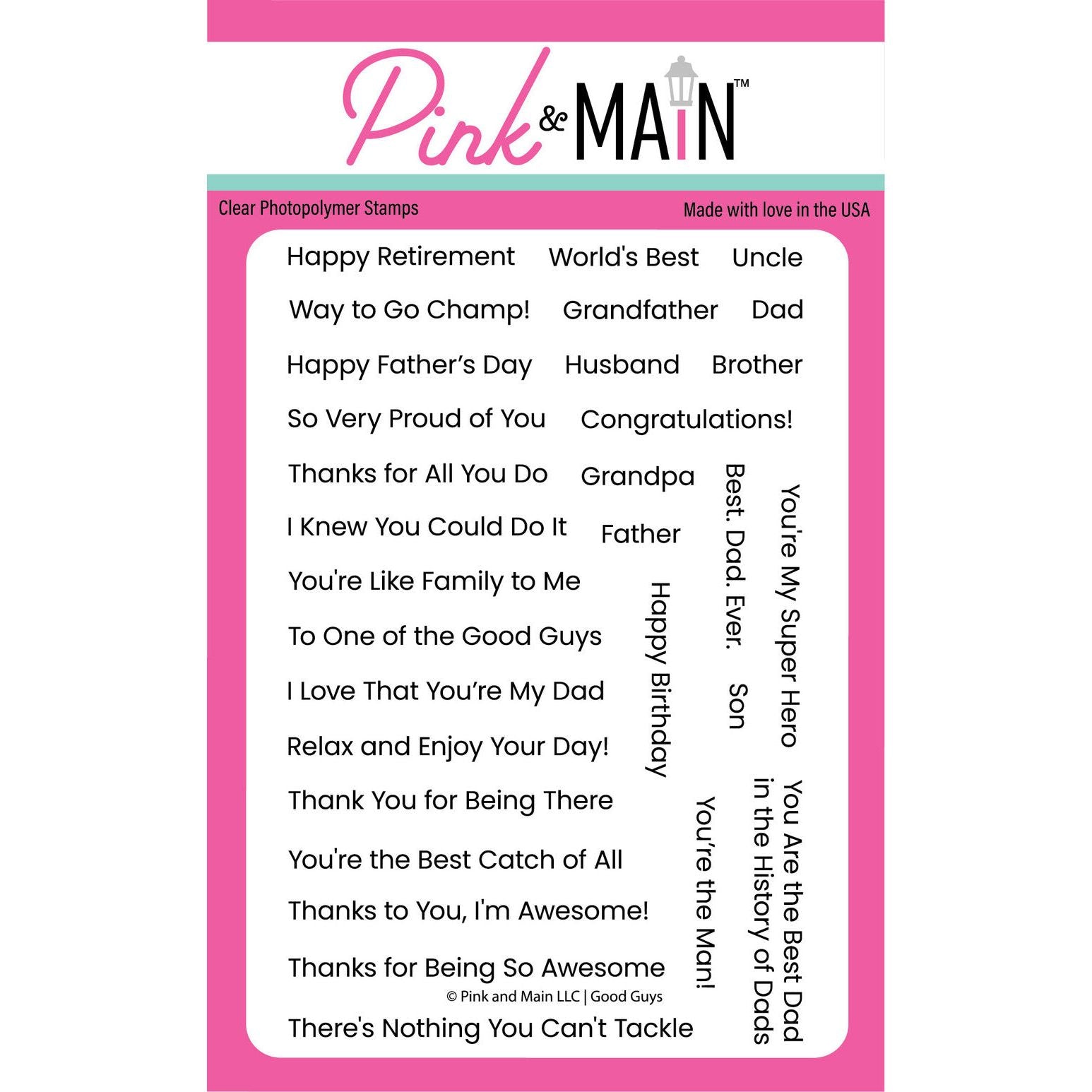 Pink and Main Good Guys Clear Stamps is a 4x6 inch set featuring 30 sentiment stamps in a message strip format. Ideal for dads, grandpas, sons, brothers, uncles, and more—many messages are versatile enough for anyone. Made in the USA from high-quality photopolymer for crisp, reliable stamping. Use with an acrylic block or stamping platform.