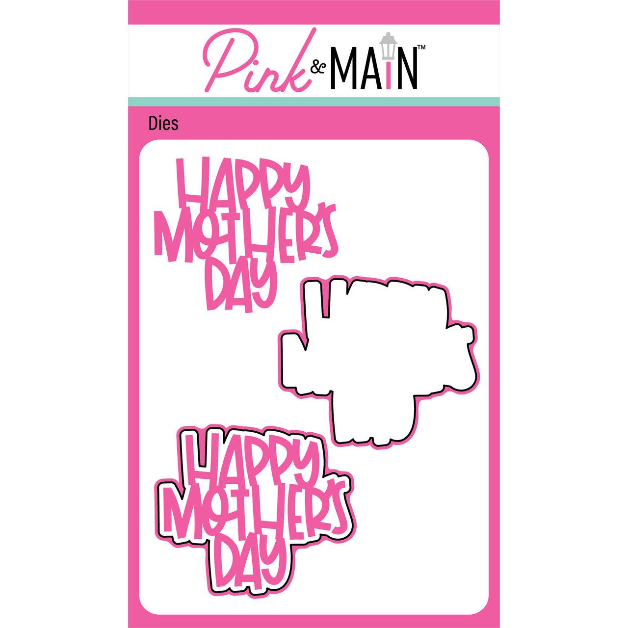 Pink and Main Happy Mother's Day Dies includes two dies that cut the phrase Happy Mother's Day along with a coordinating shadow. The shadow die measures approximately 4 x 3.45 inches. Compatible with many popular die cutting machines.
