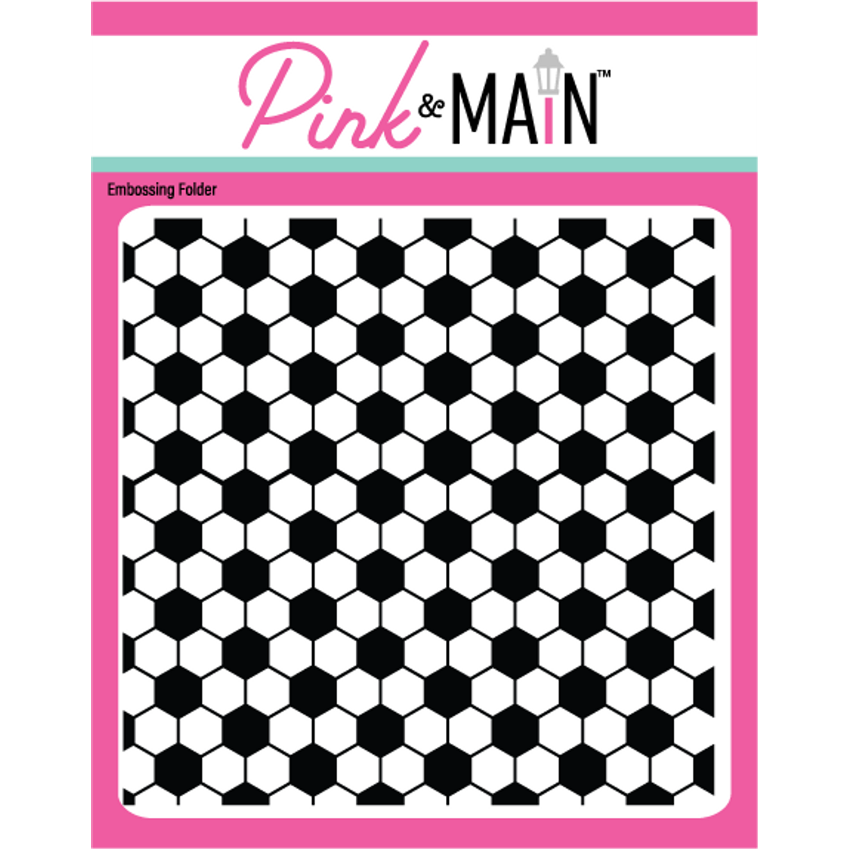 Introducing the Pink and Main Hex Tiles 6x6 inch Embossing Folder. Compatible with popular die-cutting machines, these 6x6 inch embossing folders create intricate and deep impressions. The exterior print showcases the pattern, providing a preview of the resulting design.
