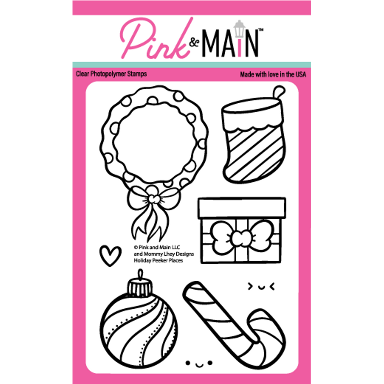 The Pink and Main Holiday Peeker Places Clear Stamps, a 4x6 stamp set, can be used independently or combined with the 'Cute Peekers' set. Coordinating dies are also available. The set features images like a wreath, stocking, ornament, candy cane, wrapped gift, and adorable faces, perfect for festive crafting.