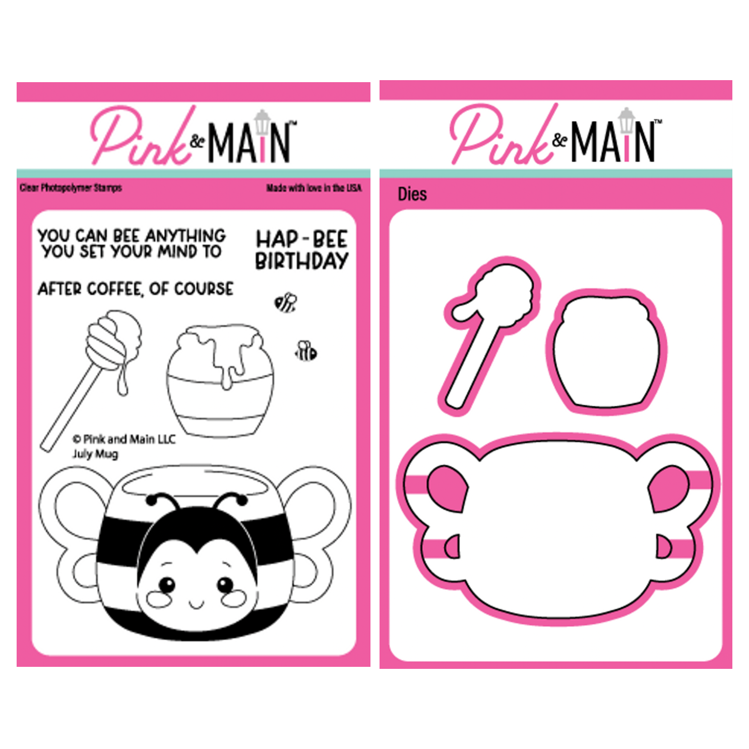 The Pink and Main July Mug Clear Stamp and Die Set is a charming addition to your crafting collection. The 3x4 inch clear stamp set pm0716 includes a sweet bumblebee mug, a pot of honey, a honey spoon, two bees, and three sentiments. The coordinating July Mug dies pnm654 perfectly cut out the stamped shapes and are compatible with popular die cutting machines such as the Big Shot, Spellbinders Platinum, Gemini, and more. This delightful set is perfect for creating adorable and cheerful projects.