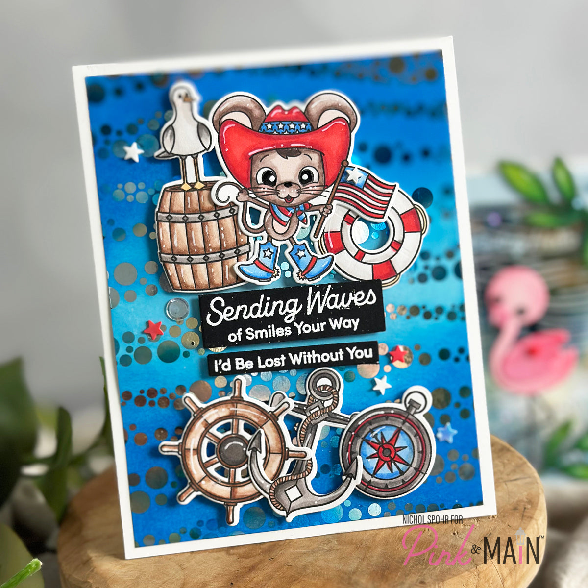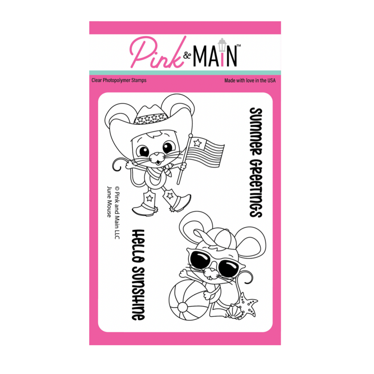The Pink and Main June Mouse Clear Stamps is a 3x4 inch set featuring two adorable mice ready for summer fun. One mouse is dressed for the beach with a ballcap, sunglasses, and a beach ball, while the other wears a patriotic cowboy hat and boots, proudly holding a USA flag. The set also includes two coordinating sentiments. Pairs with the June Mouse Dies PNM762, sold separately. Perfect for summertime and patriotic-themed projects.