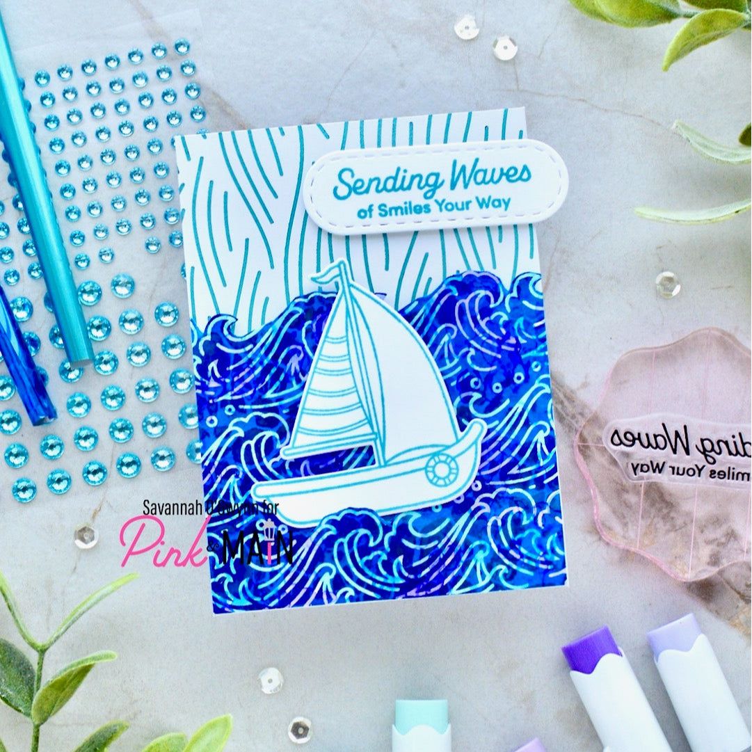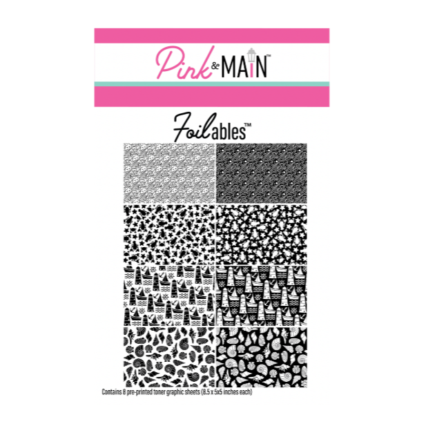 The Pink and Main Nautical Foilable Sheets feature 8 unique 8.5 x 5.5 inch designs with fun nautical-themed patterns, including sailboats, seashells, lighthouses, crabs, lobsters, and waves, each presented in both positive and negative formats. This set includes eight toner-printed sheets, one of each design, ready to be foiled using toner foils with a laminator or foiling machine. Perfect for adding shimmer and a playful coastal vibe to your cards, tags, and summer-themed paper crafts.
