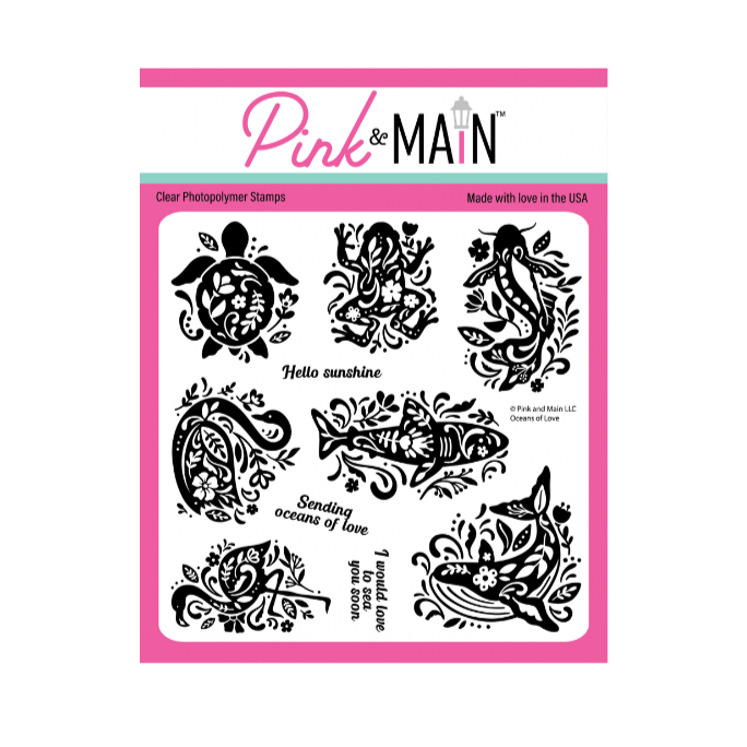The Pink and Main Oceans of Love Clear Stamps is a 6x6 inch set featuring silhouette birds, reptiles, and sea creatures, each adorned with an elegant folk art floral pattern. The set also includes three coordinating sentiments to complete your designs. Perfect for creating bold, artistic ocean-themed projects. Pairs with the Oceans of Love Dies PNM761, sold separately.