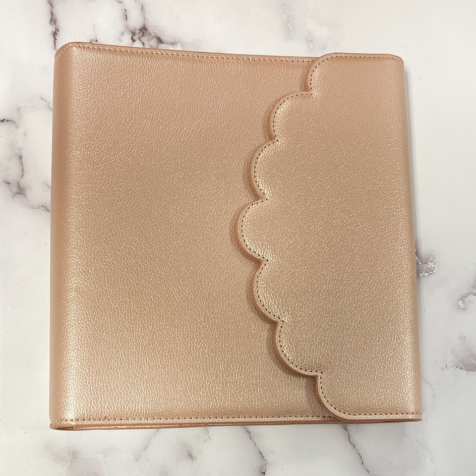 The Pink and Main Rose Gold Planner brings elegance and organization together in one beautiful binder. Crafted from sleek, durable vegan leather, it features a charming scalloped flap and a secure magnetic closure. Inside, you'll find multiple pockets, two pen loops, and a 6-ring binding system to keep your inserts neatly in place. Ideal for planning, journaling, or storing crafting supplies, this chic planner adds a polished touch to your creative space. Mix and match with other Pink and Main planners and accessories!