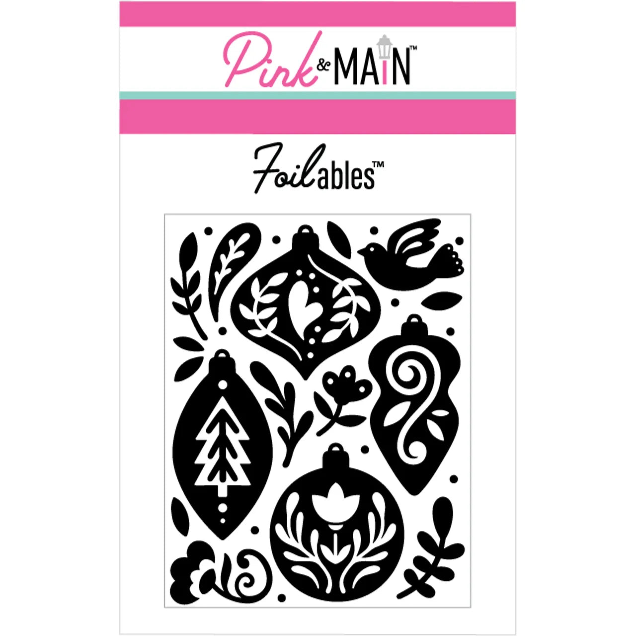 The Pink and Main Scandinavian Ornaments Foilable Panels set includes 8 panels, each measuring 4 x 5.25 inches, featuring beautiful Scandinavian-inspired designs. The panels showcase four different ornament shapes adorned with leaf, flower, and bird accents. These sheets are ready to be foiled with CheerFoils and Minc machines, adding a perfect touch of shine to your holiday projects.